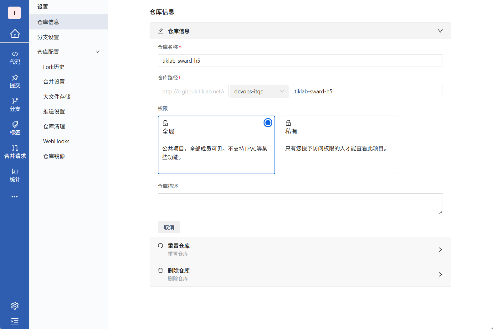 重置仓库,会直接将代码仓库将会被重置为空仓库,不删除仓库