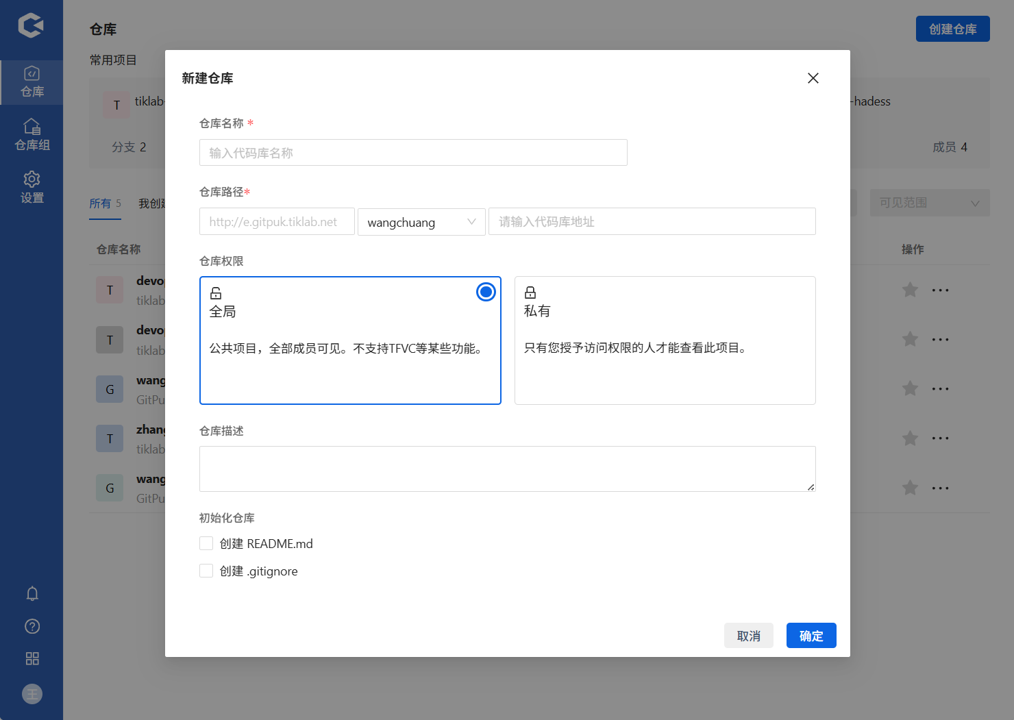 | 初始化仓库 | 否 | 初始化README.md文件 、 .gitignore文件 |