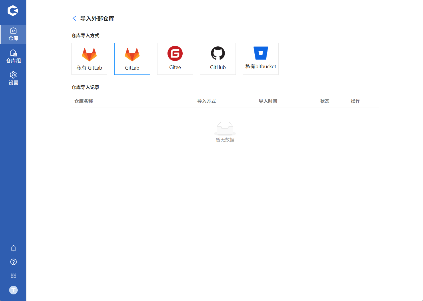 支持GitLab、Gitee、GitHub、bitbucket第三方代码仓库工具的导入。导入详情