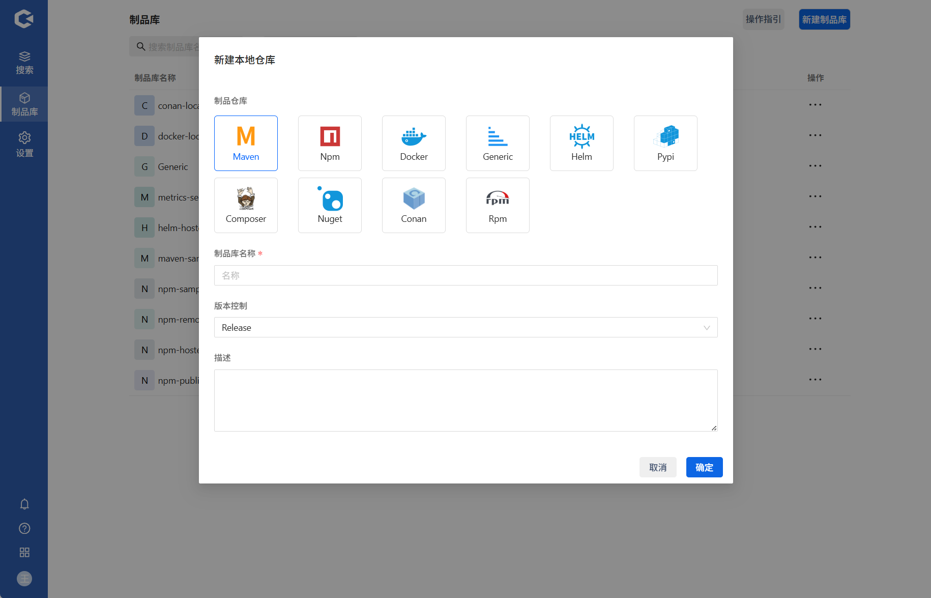 制品库分为Maven、Npm、Docker 、Go、Helm、Generic类型