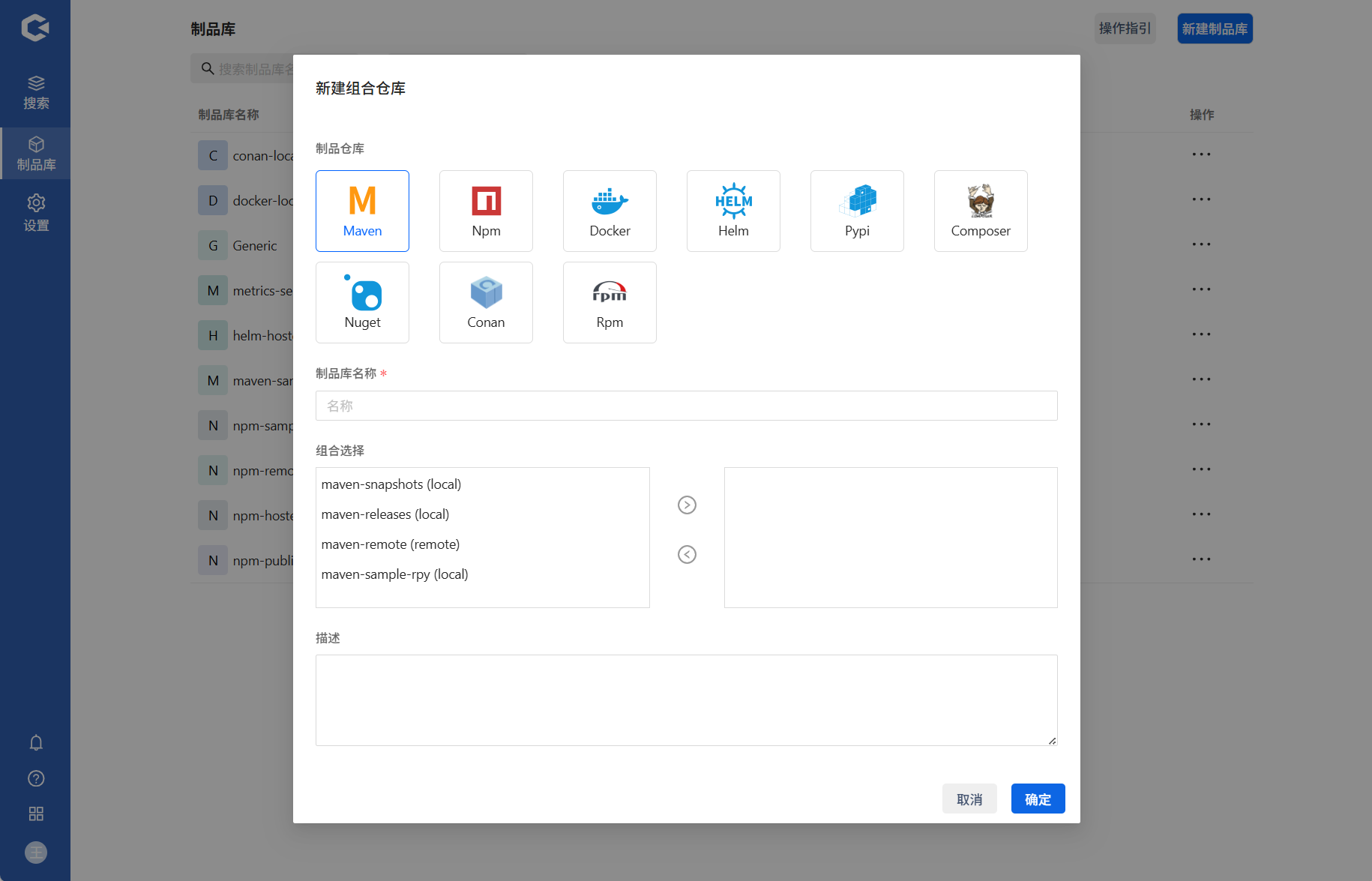 点击新建制品库 —> 选择新建组合库 —> 填写信息确认