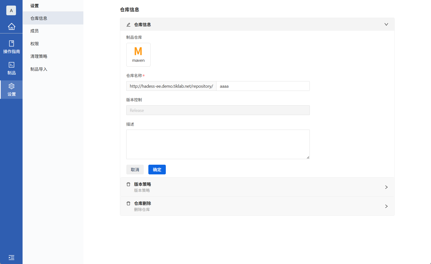 仓库信息里面分为修改仓库、仓库策略、删除仓库