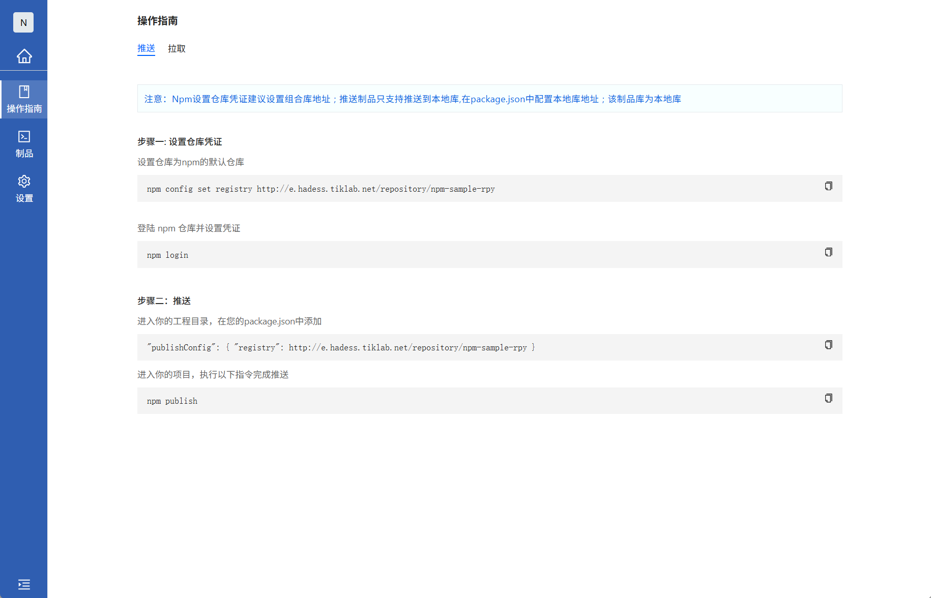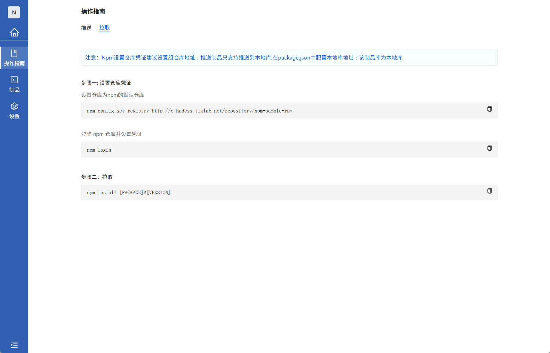 进入Npm类型组合库,查看操作指南的拉取