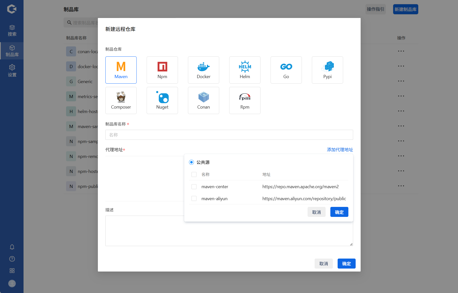 点击新建制品库 —> 选择新建远程库 —> 填写信息确认