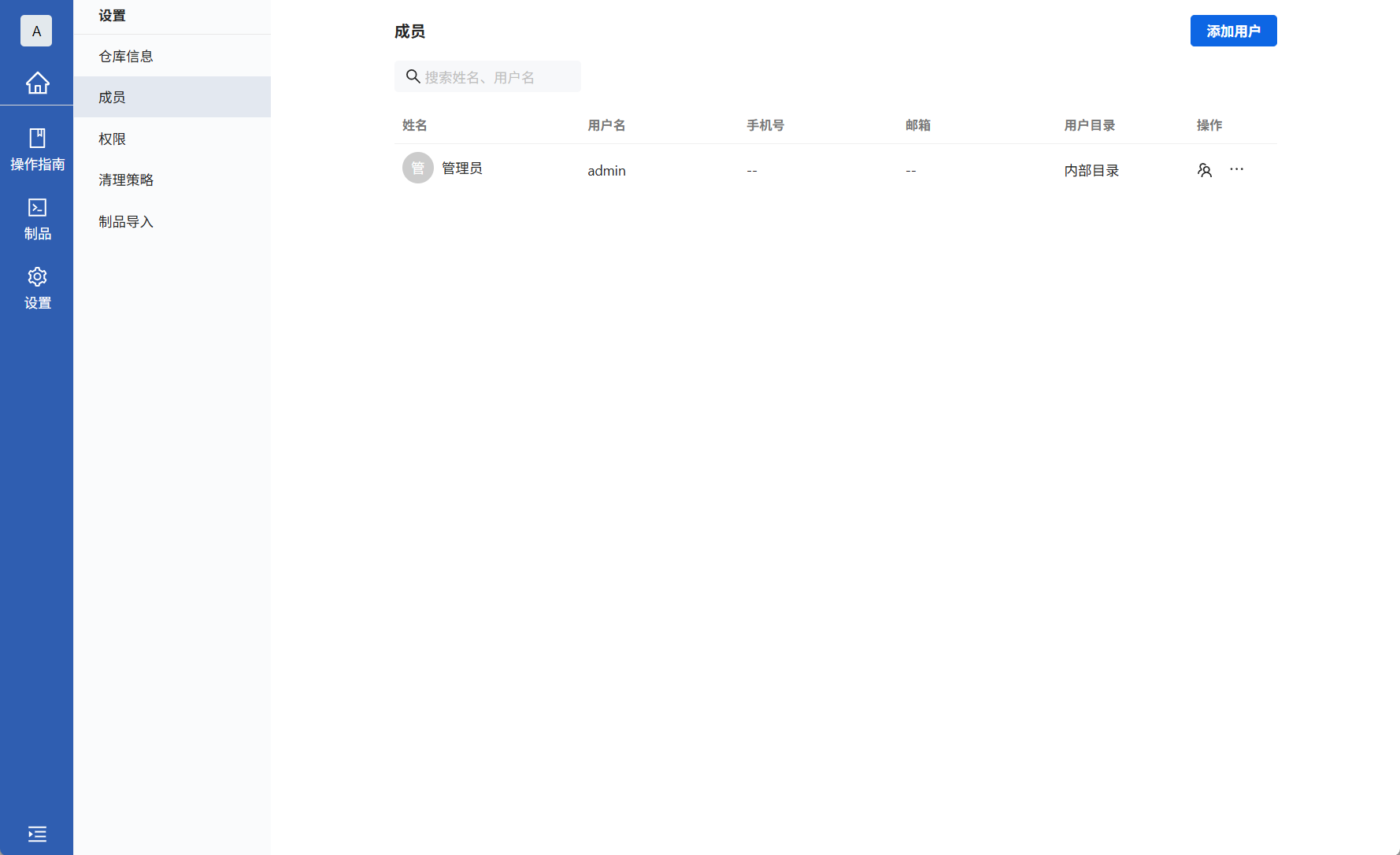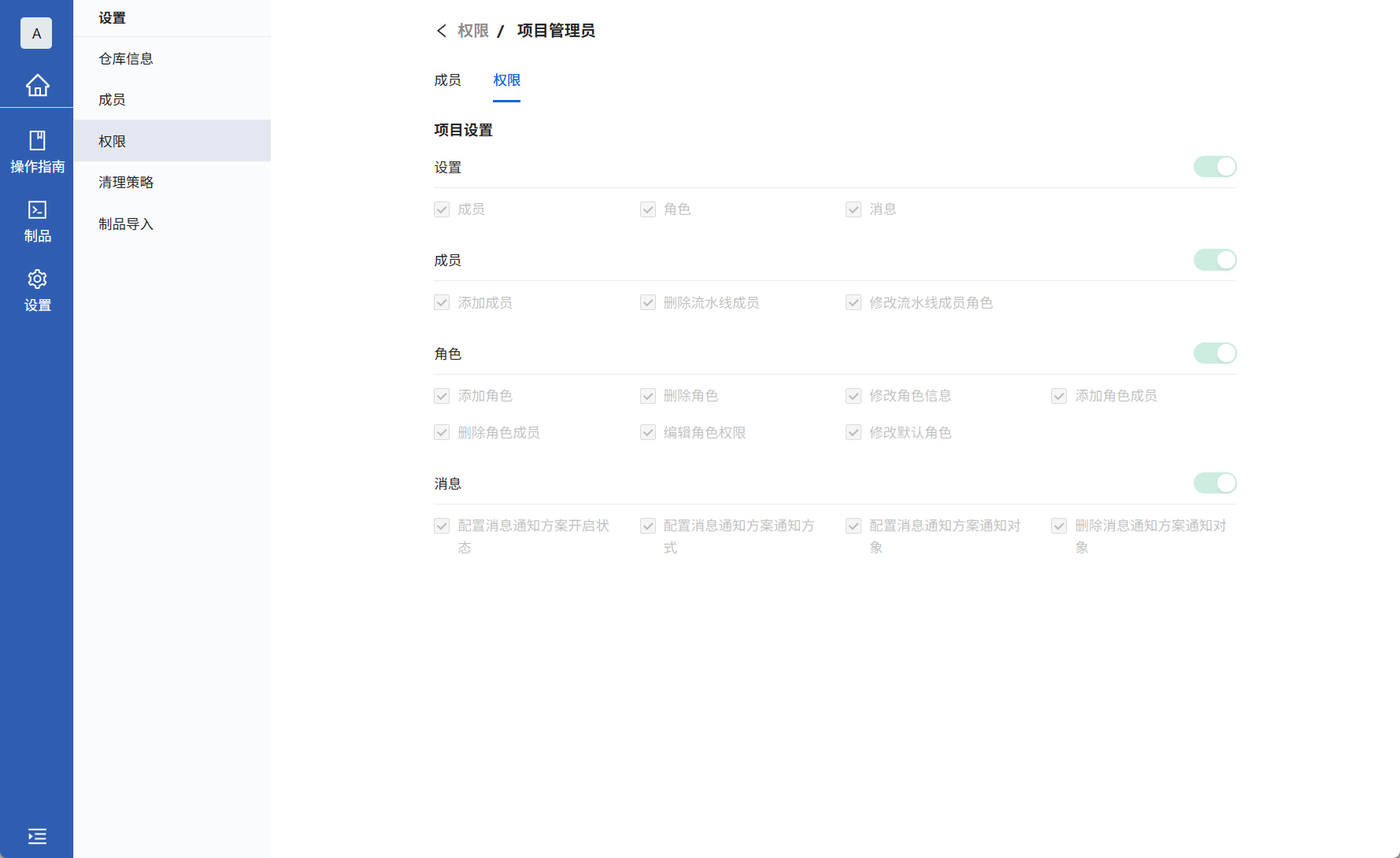 仓库设置分为仓库信息、成员、权限功能