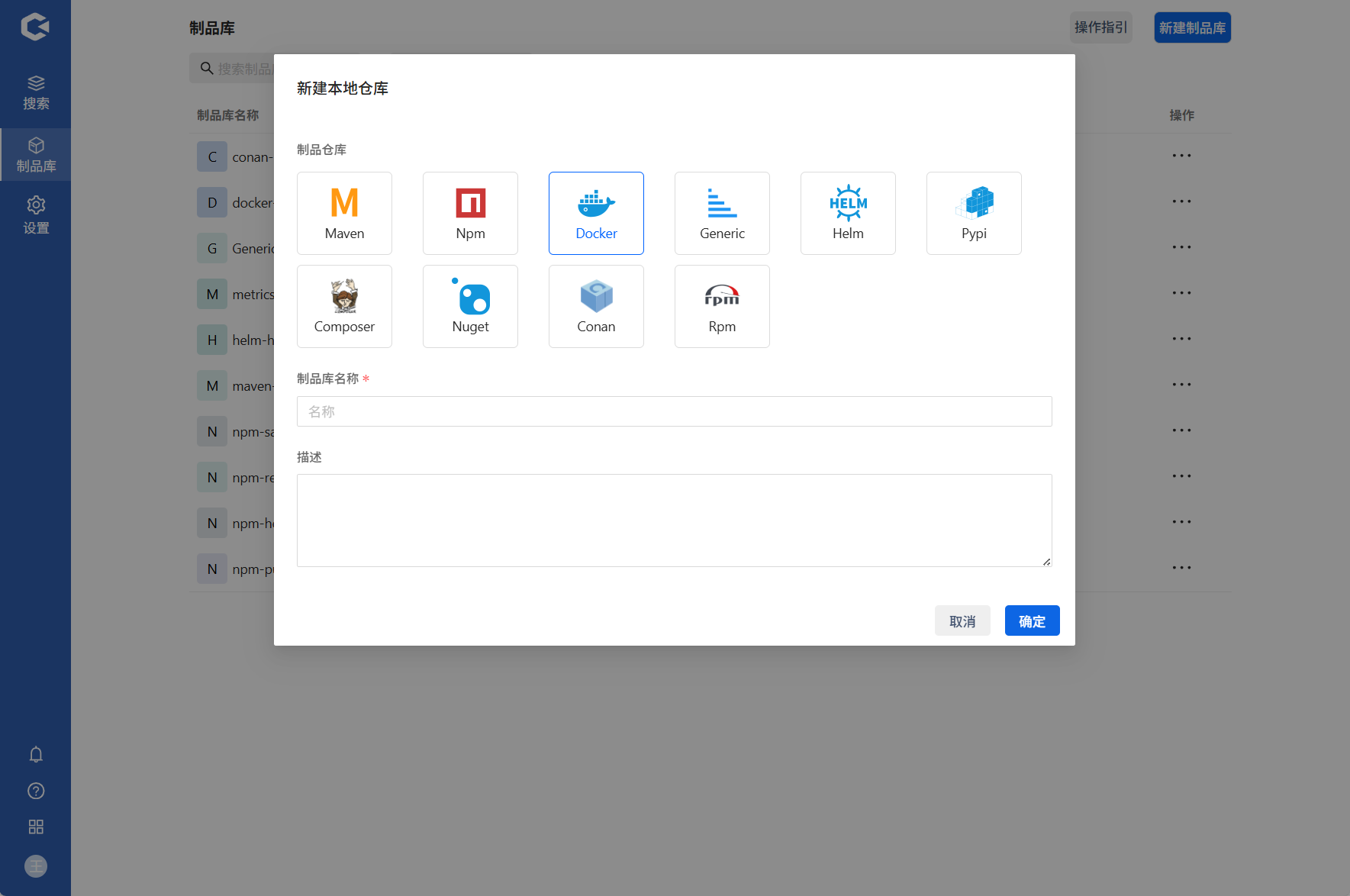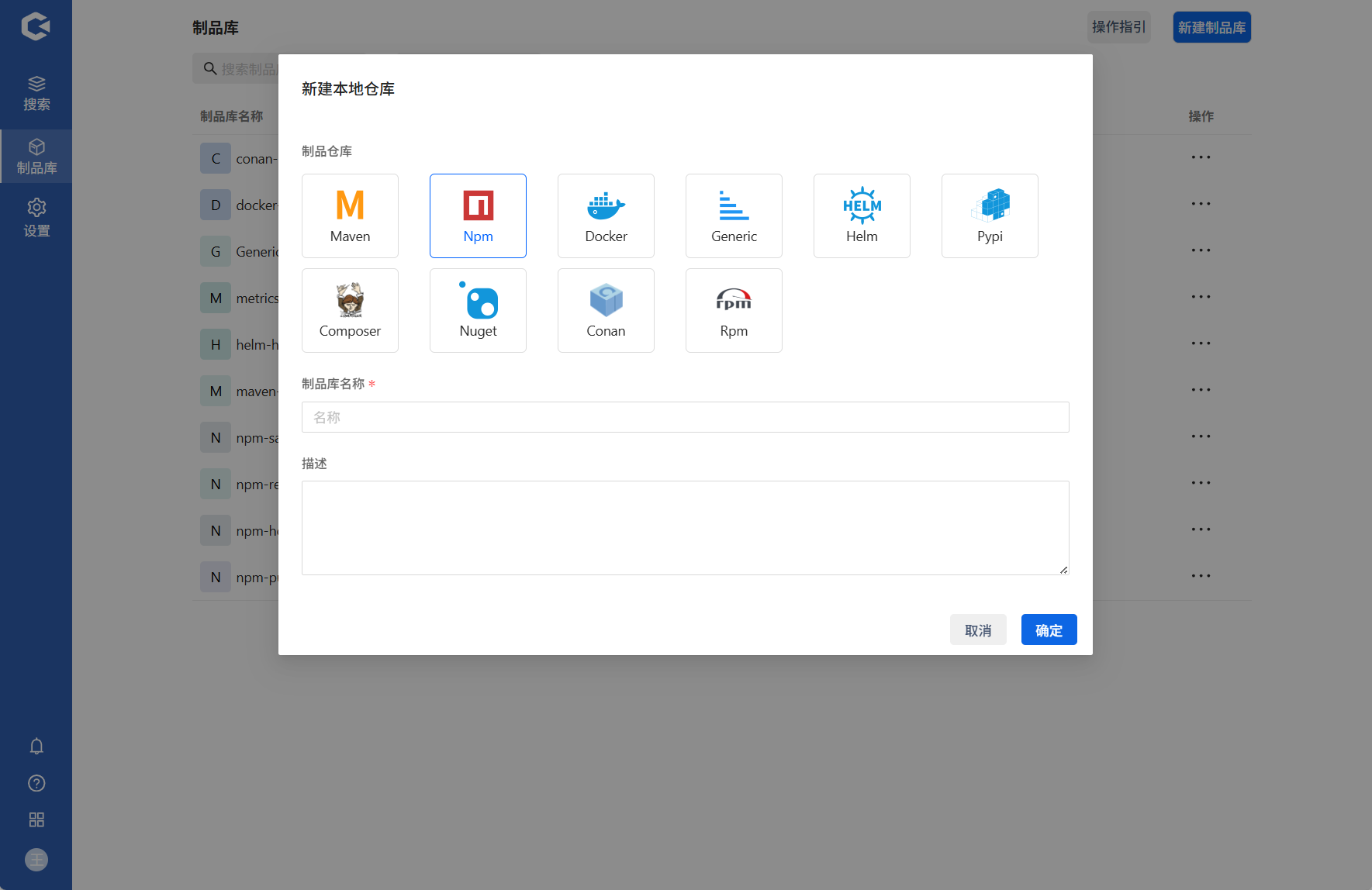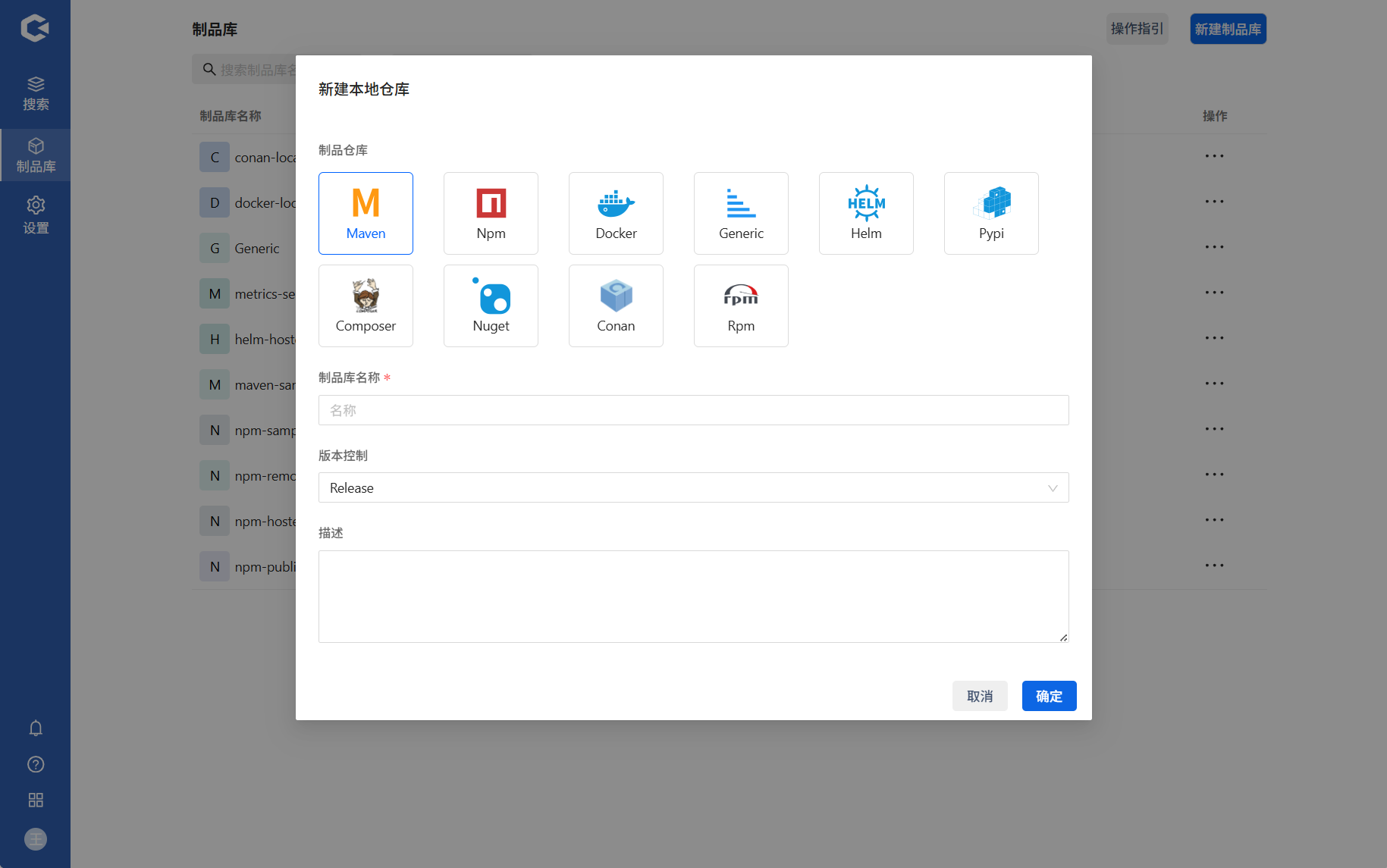 制品库分为Maven、Npm、Docker等多类型制品