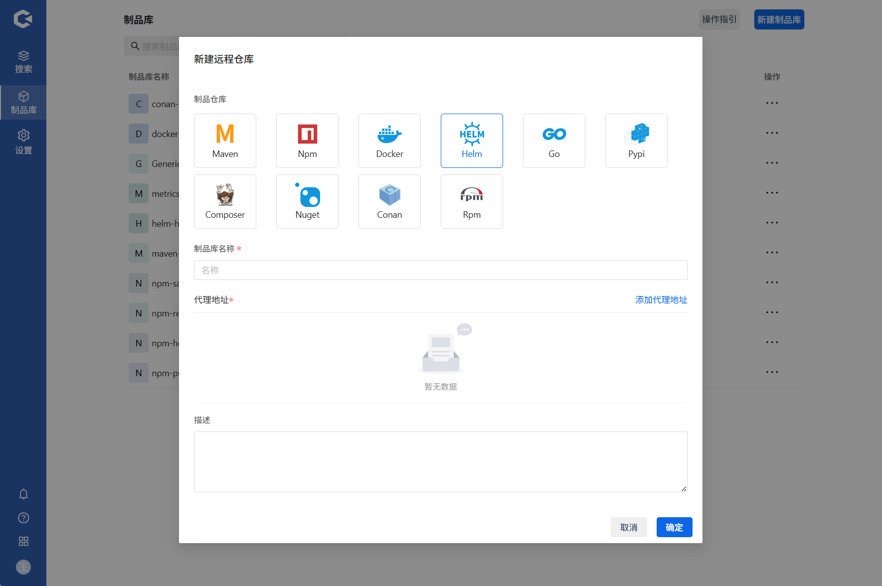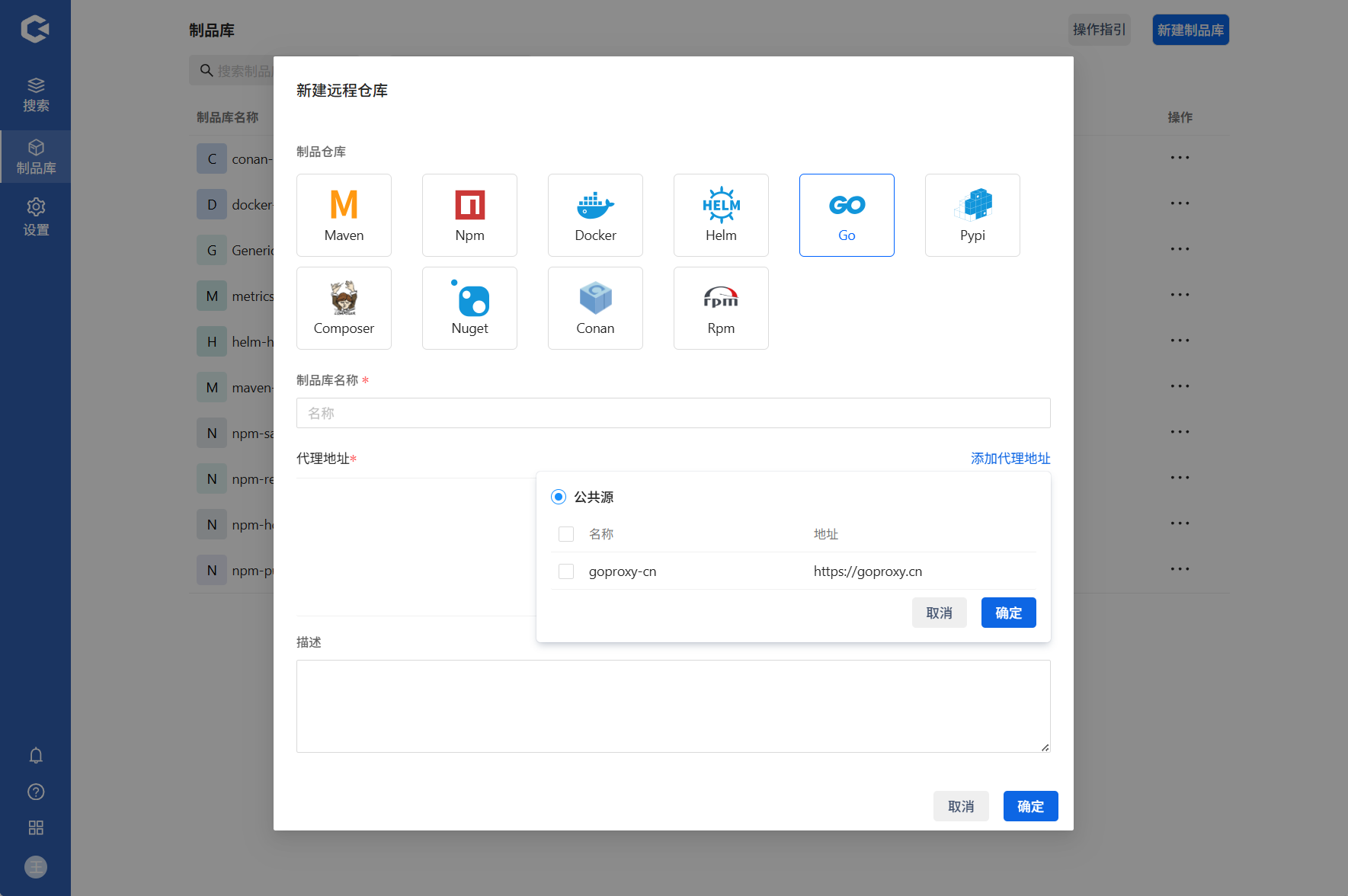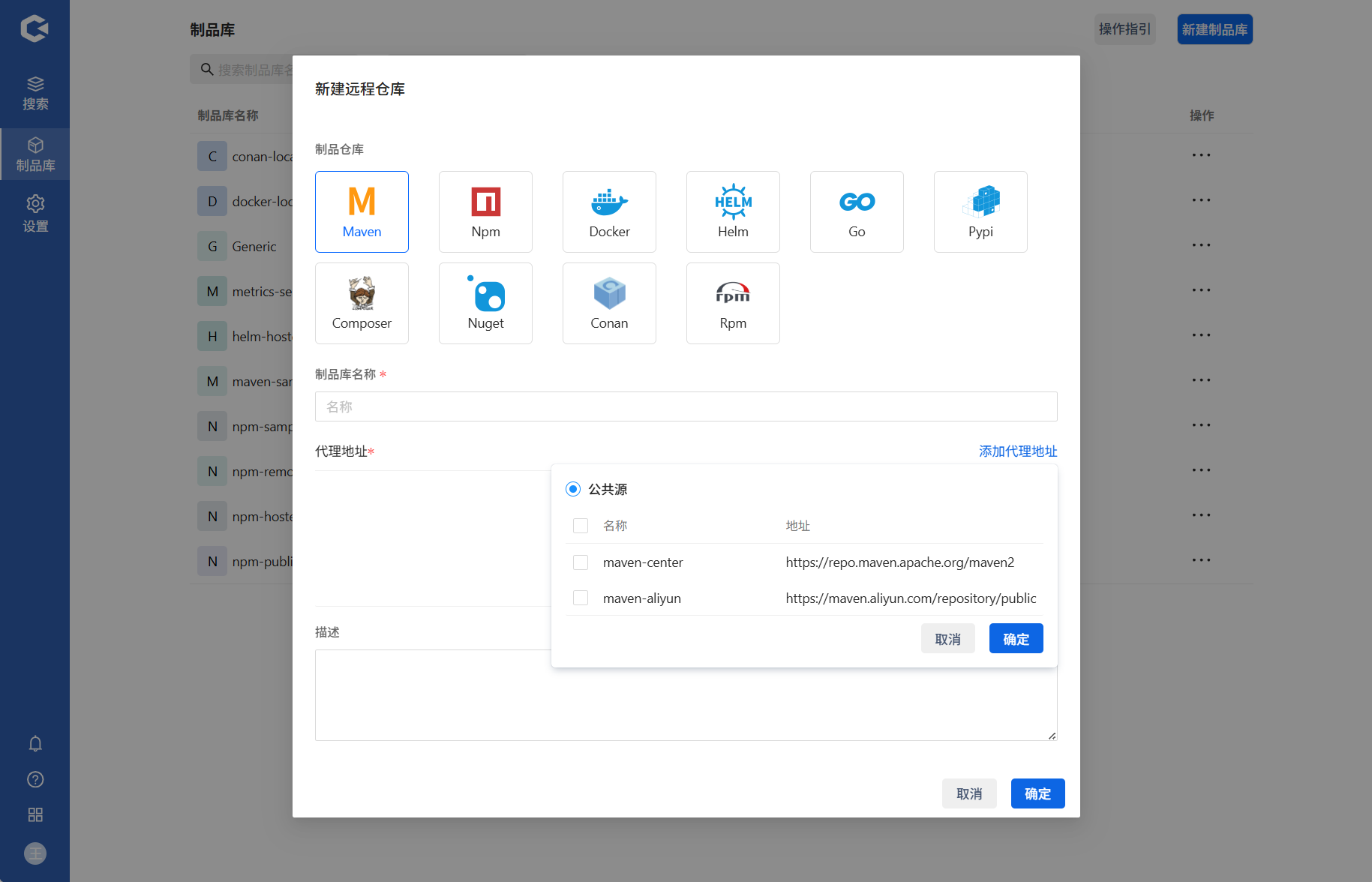 点击新建制品库 —> 选择新建远程库 —> 填写信息确认