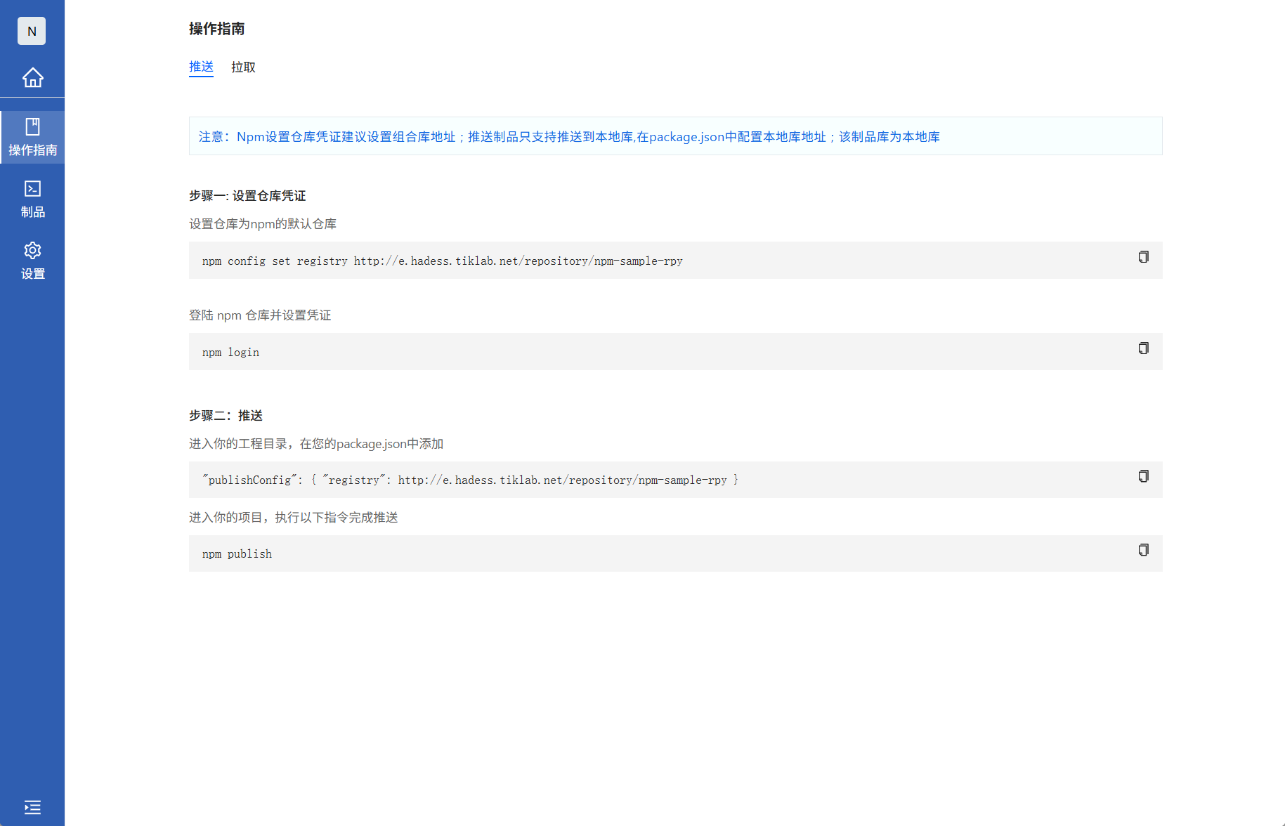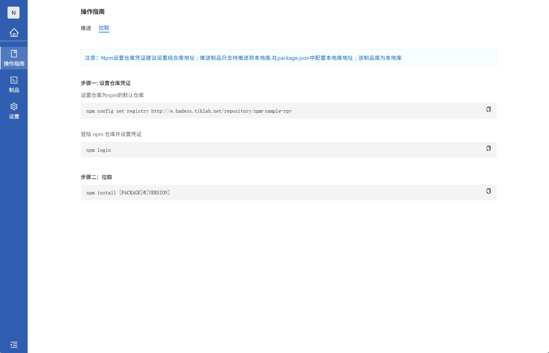 进入Npm类型组合库,查看操作指南的拉取