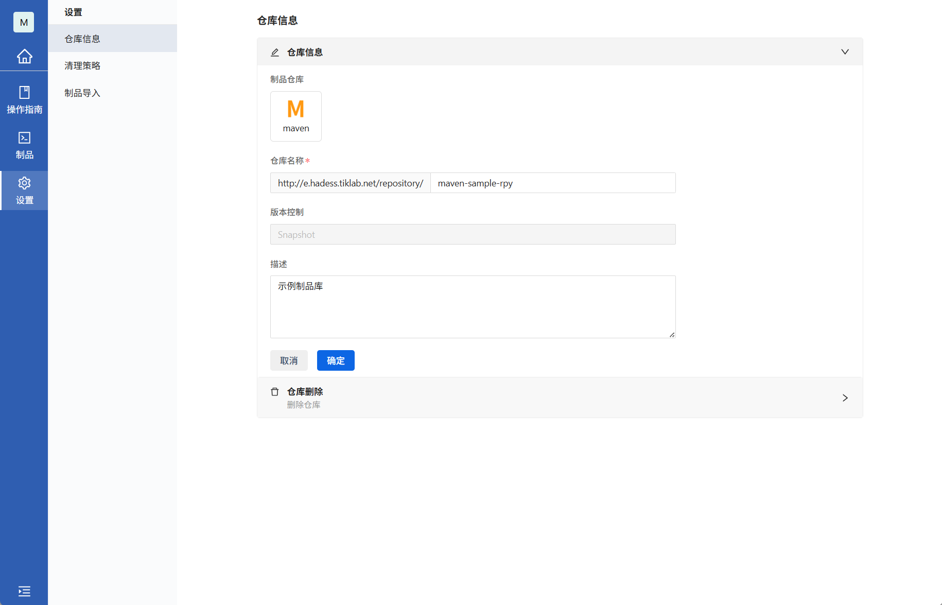 | 制品仓库 | 是 | 制品库的类型,选择maven |