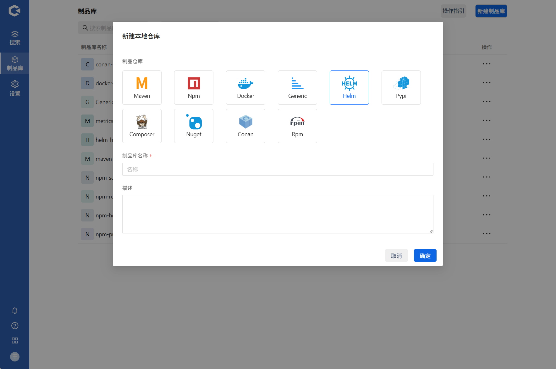 点击新建制品库 —> 选择新建本地库 —> 填写信息确认
