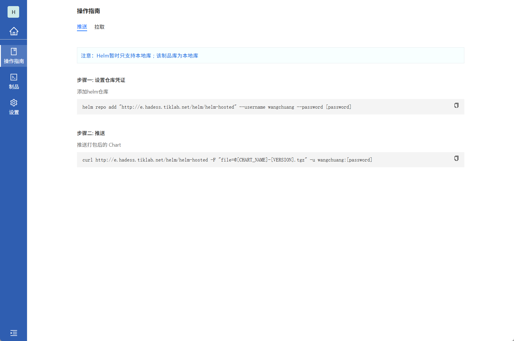 进入Helm类型的本地库,查看操作指南推送。或者查看文档 Helm推送文档