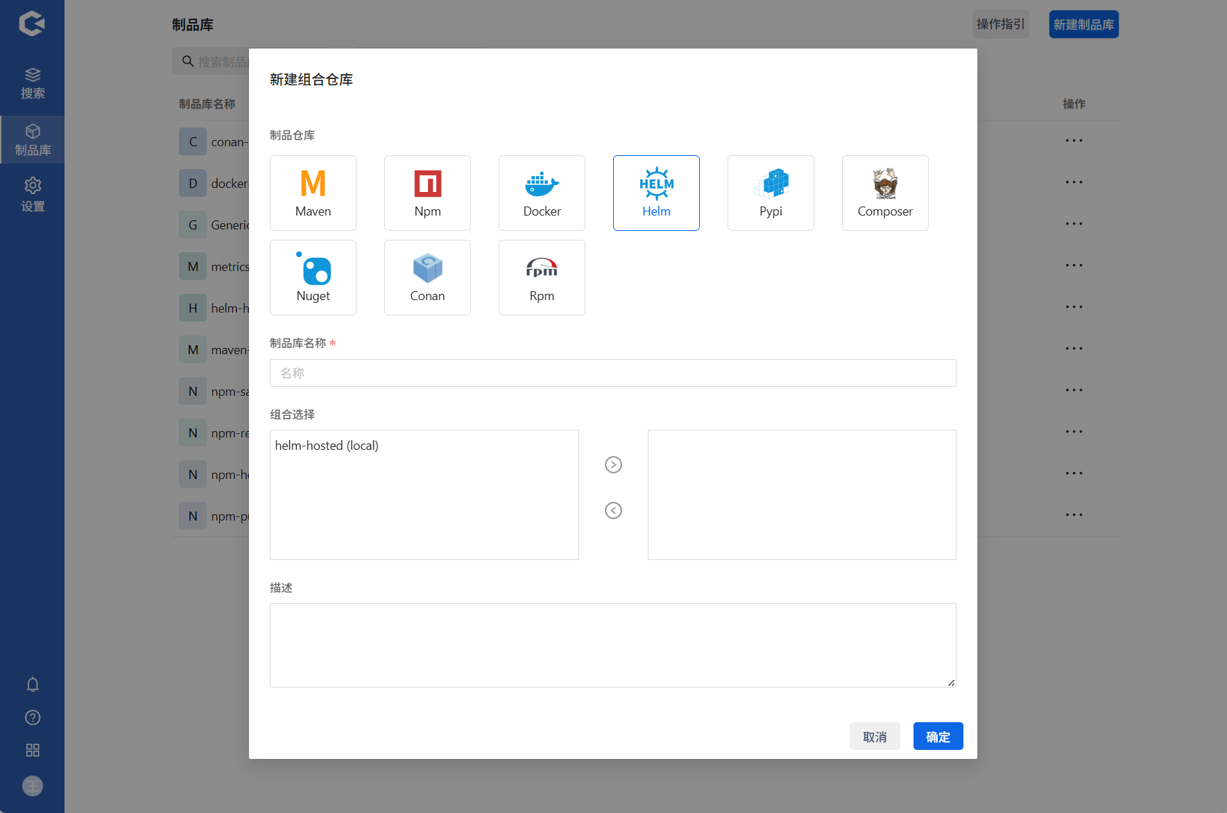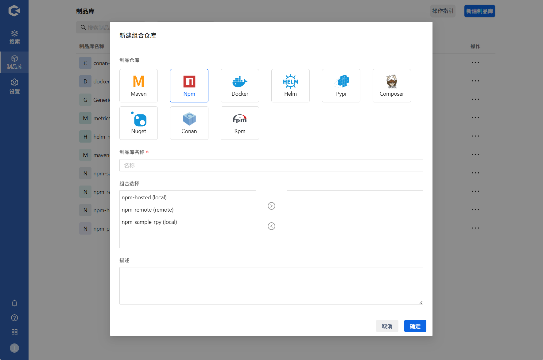 点击新建制品库 —> 选择新建组合库 —> 填写信息确认