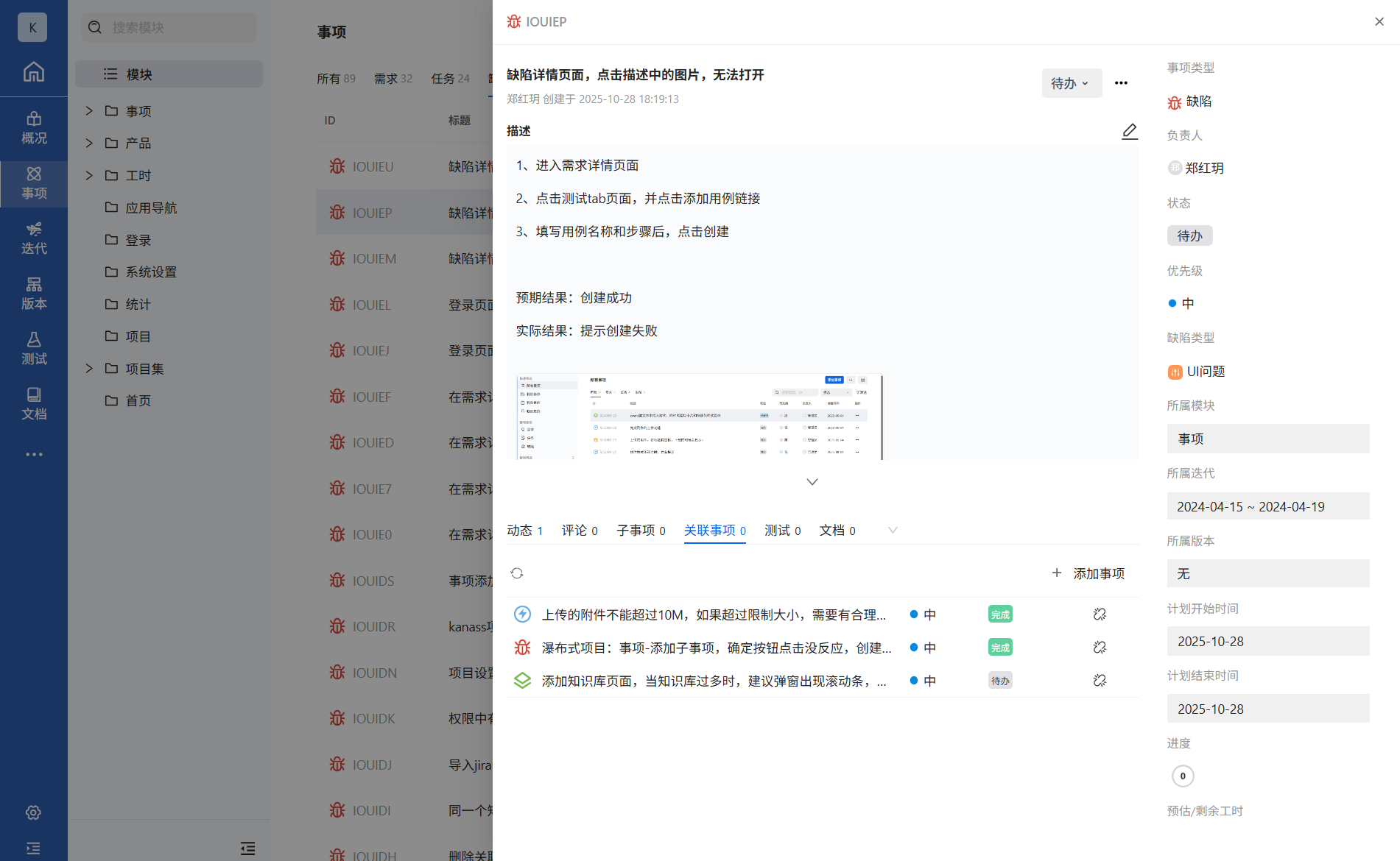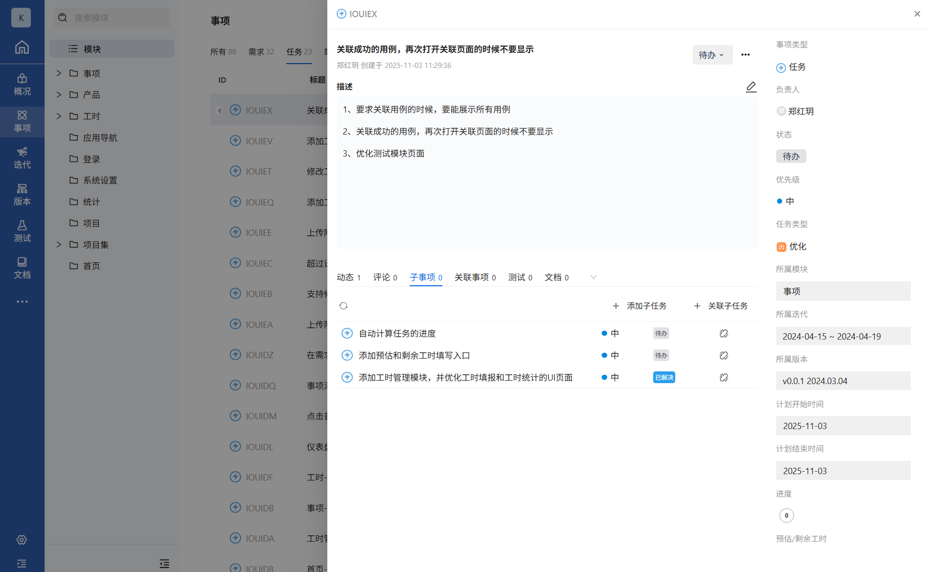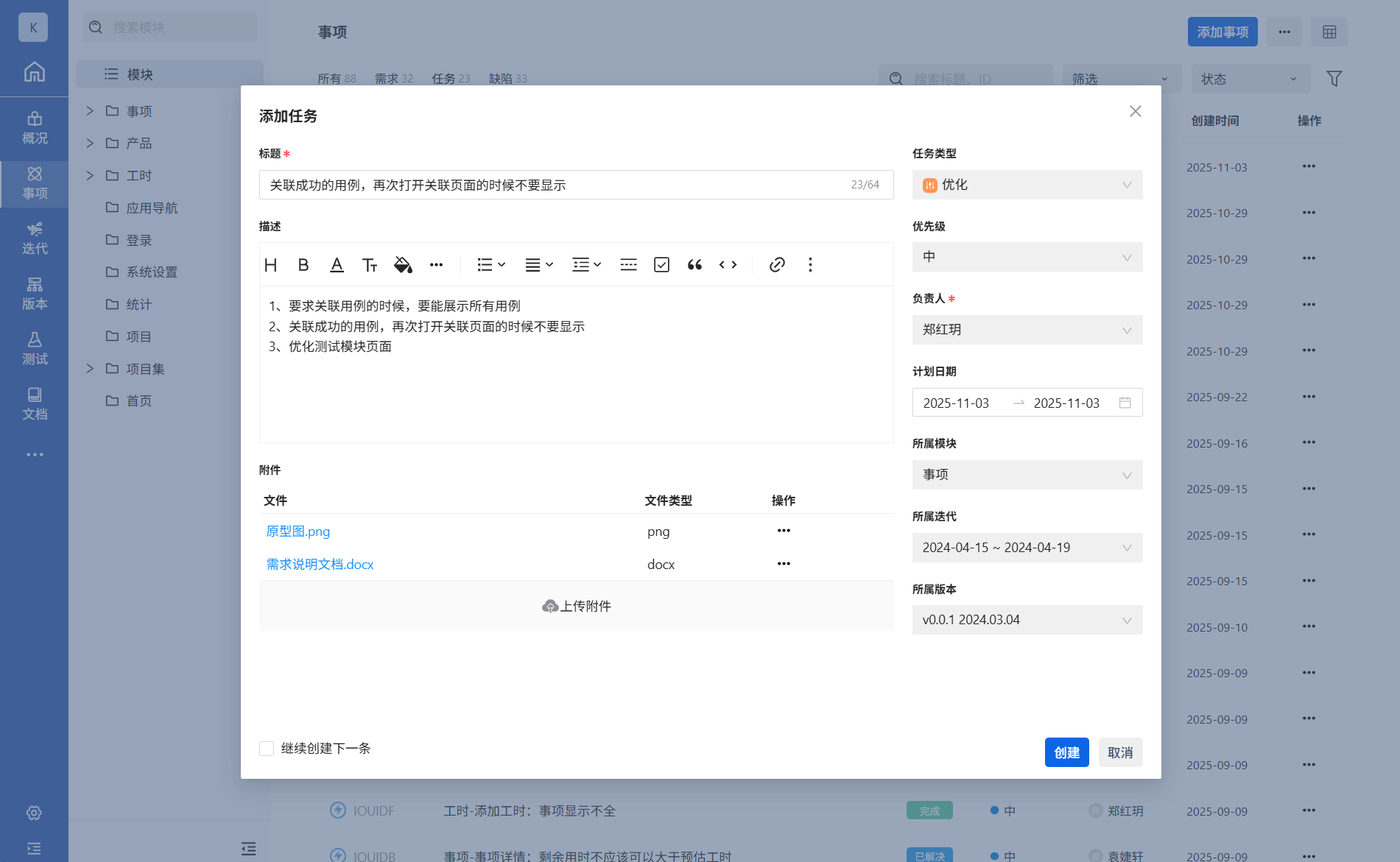| 所属迭代 | 非必填 | 用来表示当前需求属于哪次迭代。需要用户自行创建 |