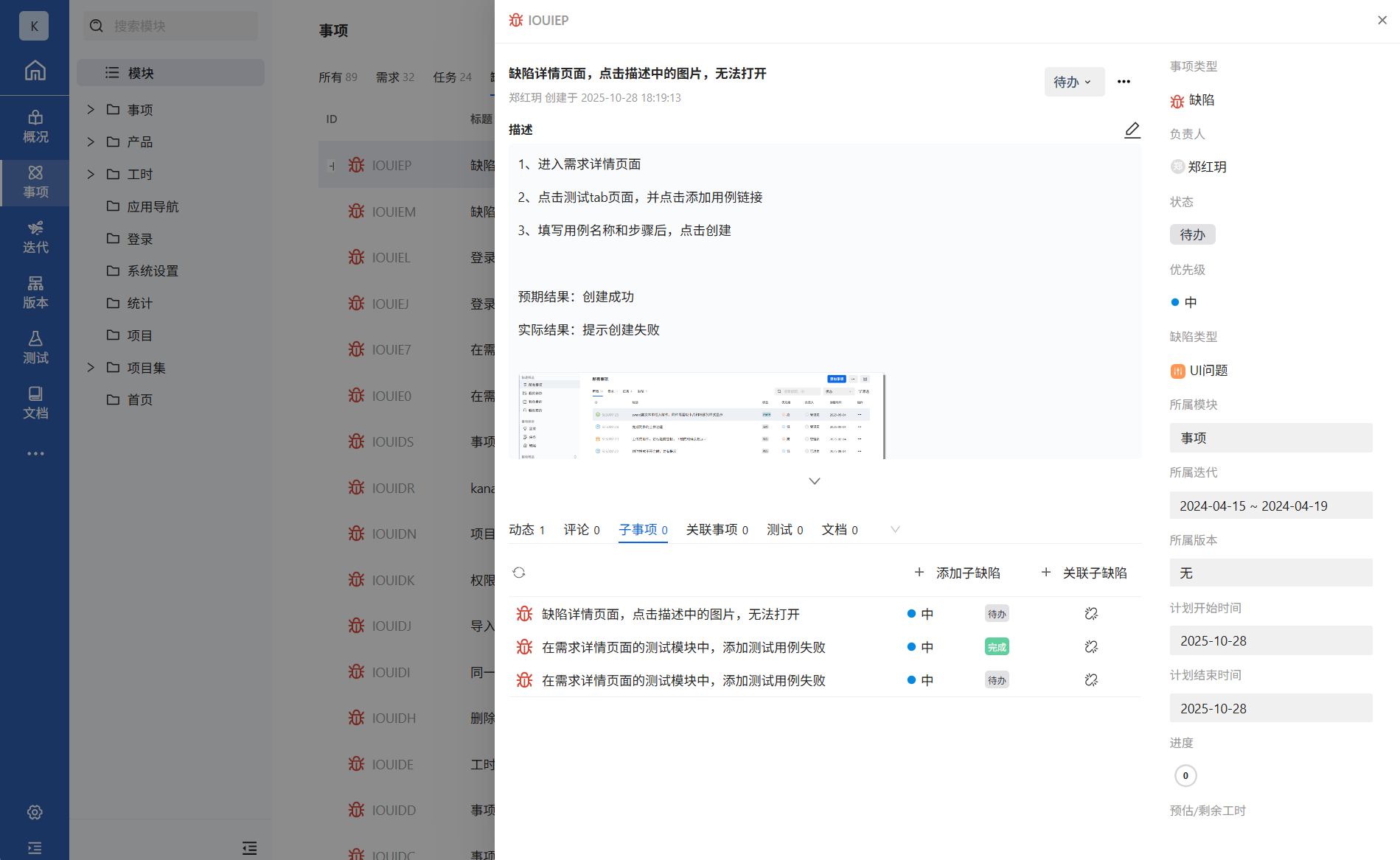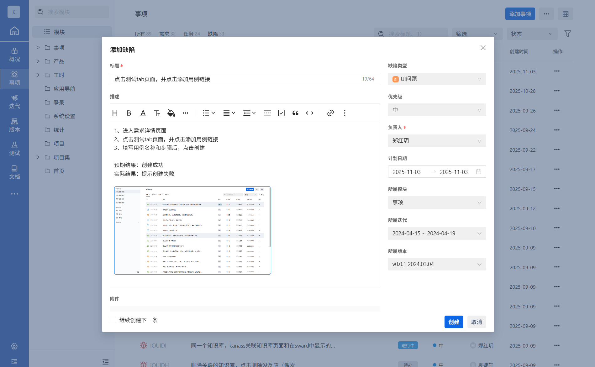 - 点击添加缺陷->输入信息->创建,缺陷添加成功
