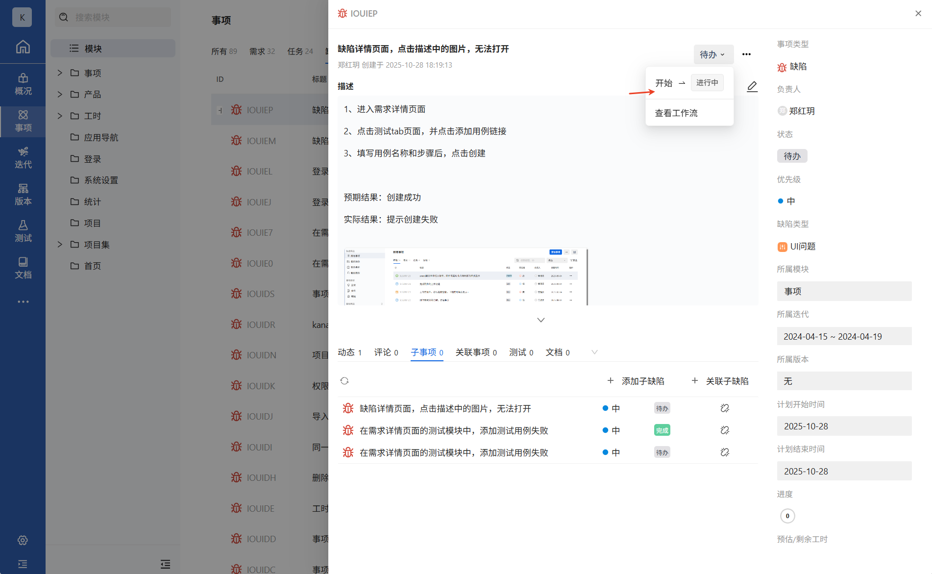 添加事项后的默认状态为待办,进入事项详情。点击待办下拉框可以根据工作流更改事项状态;点击查看工作流,可以查看当前事项类型的工作流。
