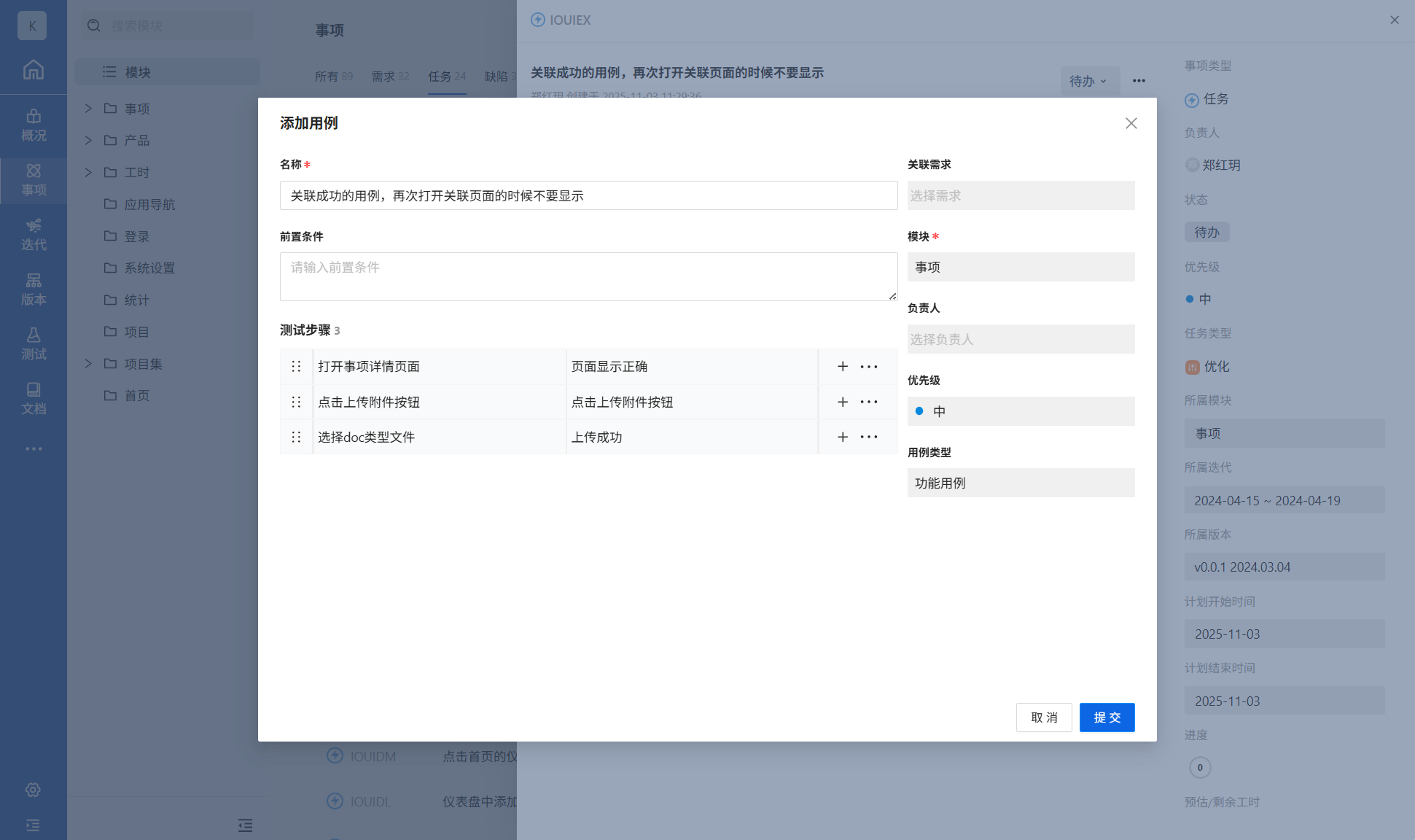 可以打开添加用例页面,输入名称、前置条件、步骤等内容后点击提交,用例创建成功。此方法添加的用例会自动关联当前需求。