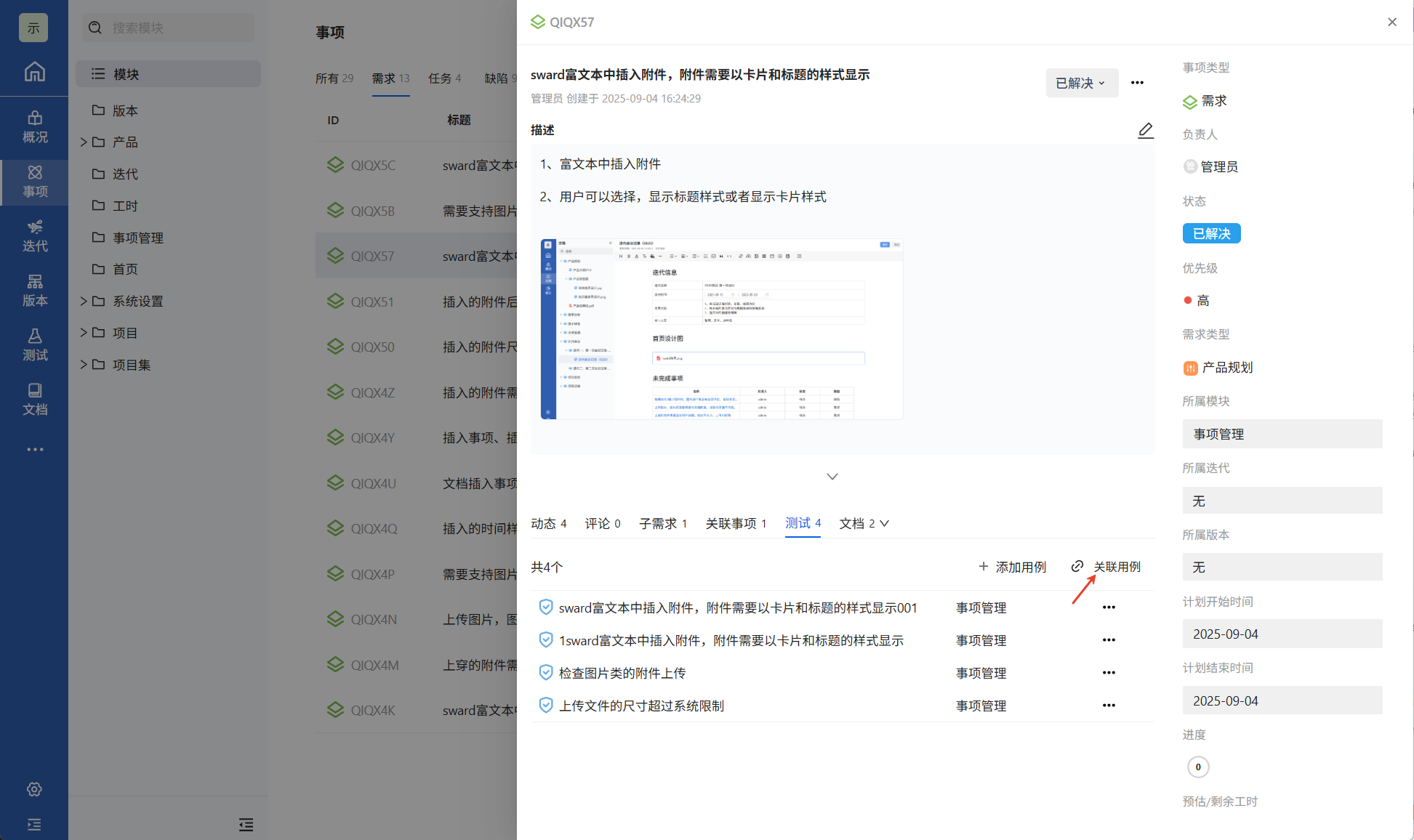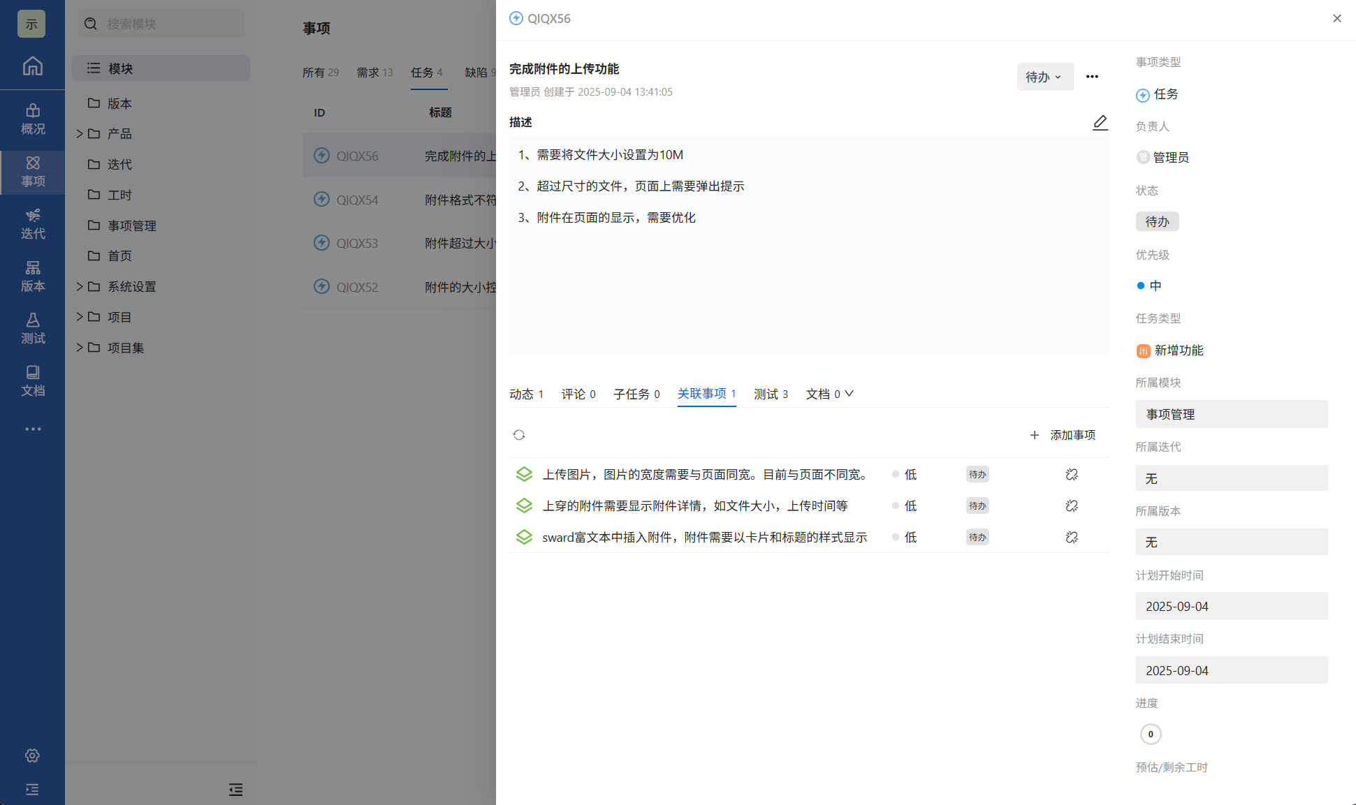点击任务标题进入任务详情页面,点击关联事项->选择需求完成任务与需求的关联。