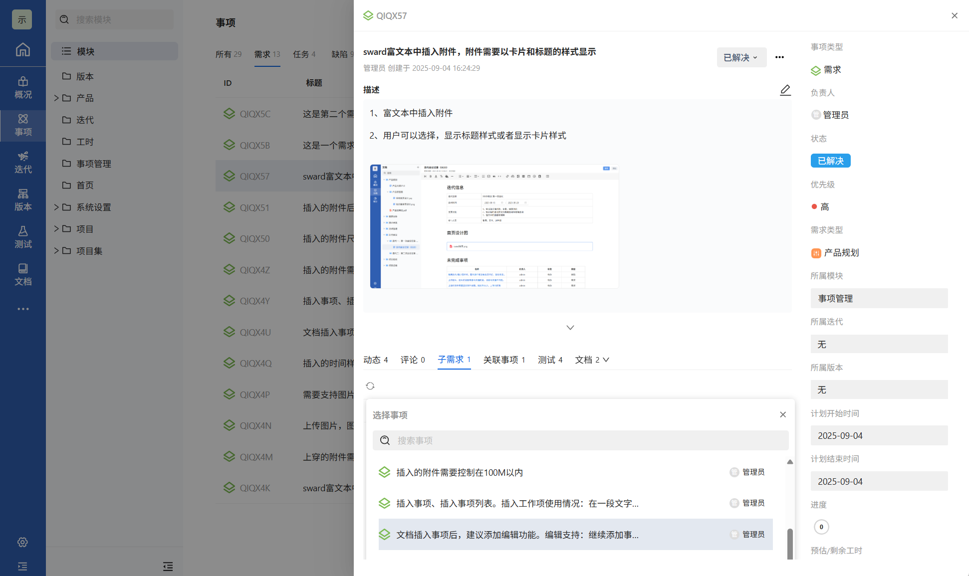 也可以通过关联子需求,将同类或者相关事项进行关联。点击子事项->关联子需求,此时会在下拉框中展示出当前项目下的所有需求,点击相关需求进行关联