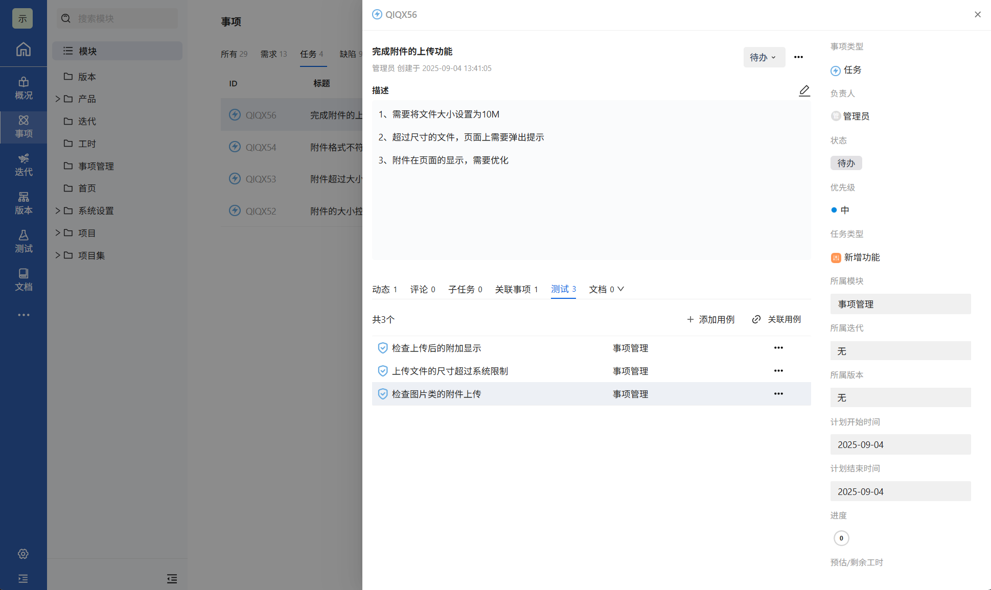 测试用例由需求和任务衍生而来,是质量保障的具体脚本,并与需求保持双向链接