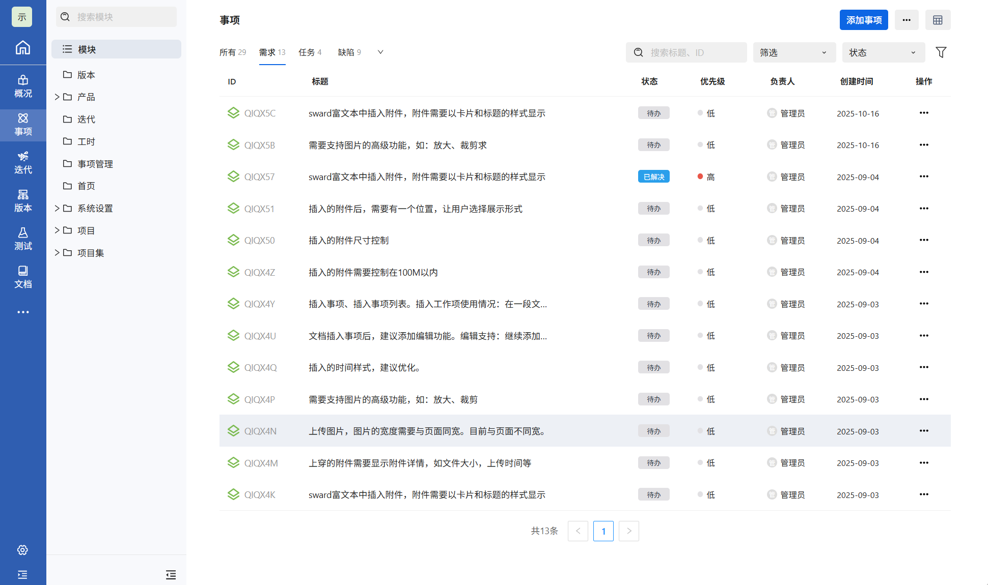 进入kanass项目,页面会自动定位到事项页面。点击添加事项->需求,填写需求标题与描述,选择需求类型等信息
