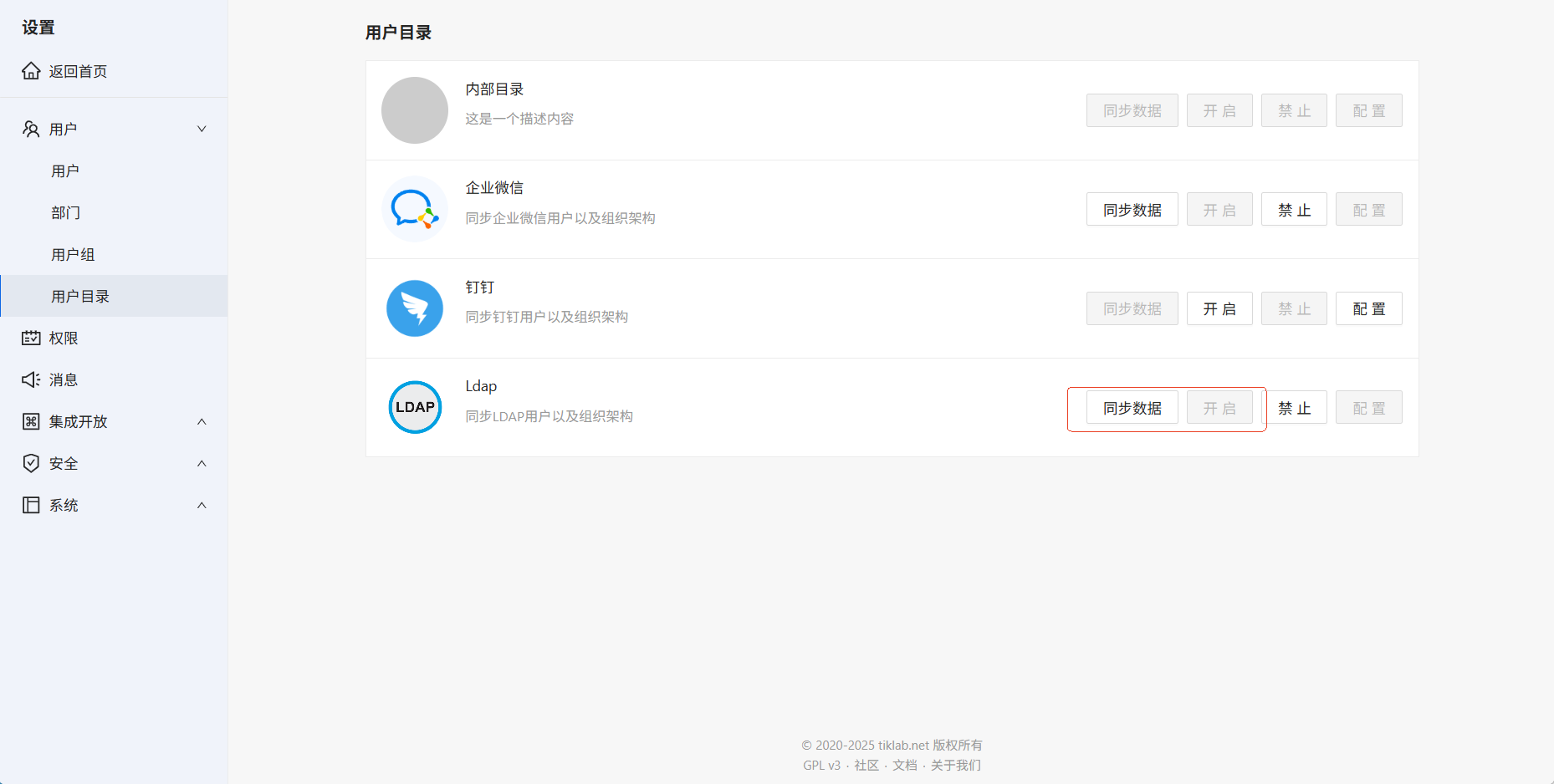 信息配置成功后,点击开启按钮,此时会提示状态修改成功且同步数据按钮亮起。点击同步数据即可同步AD域下用户