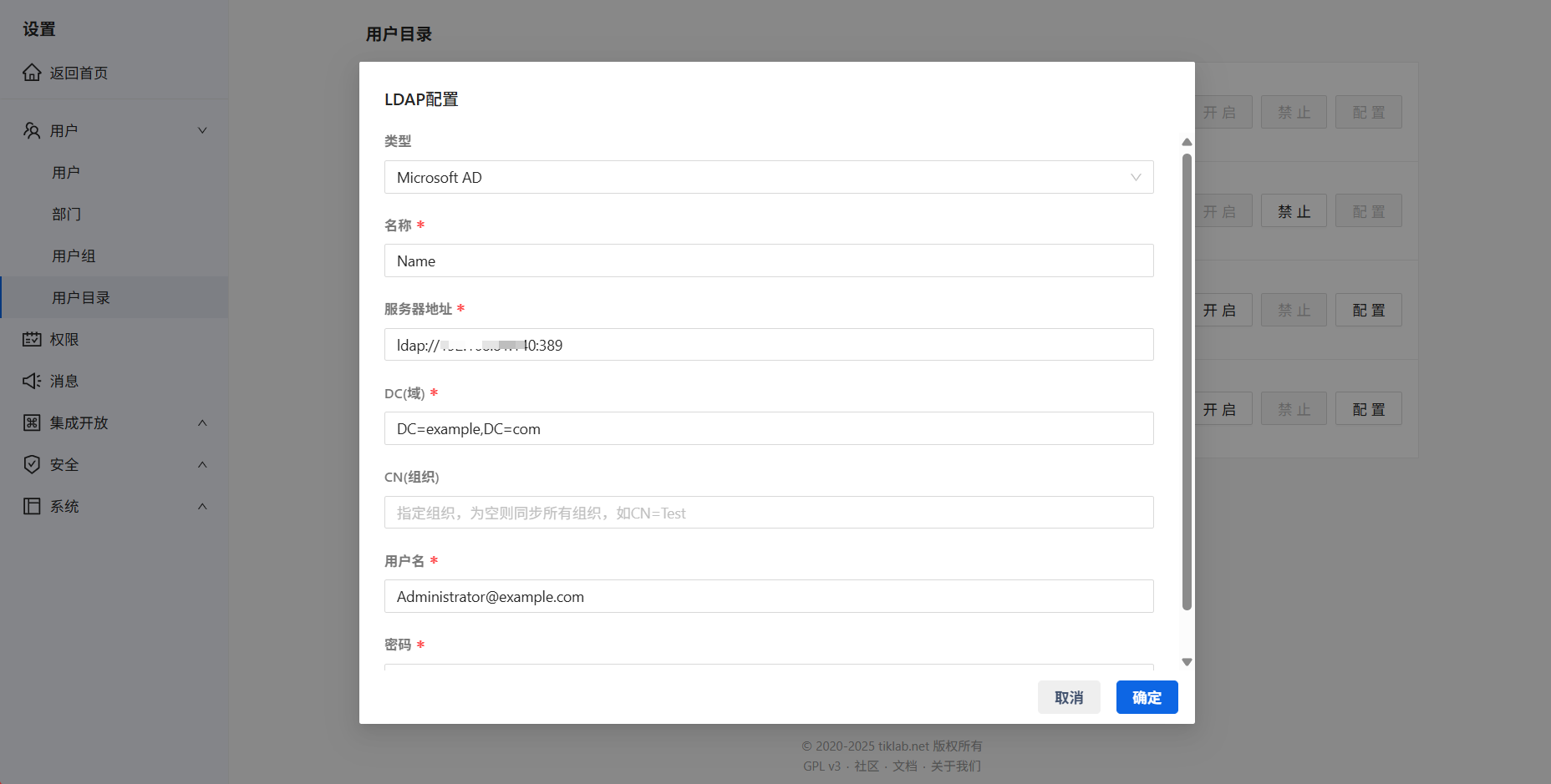 | CN(组织) | 指定同步的组织,格式:CN=test。为空则同步所有组织。 |