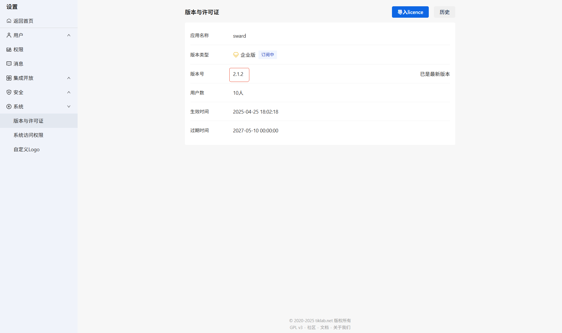 进入系统设置->系统->版本与许可证页面,可以查看到当前版本号。或者点击首页左侧导航栏中的帮助->查看版本信息,同样可以查看版本号。