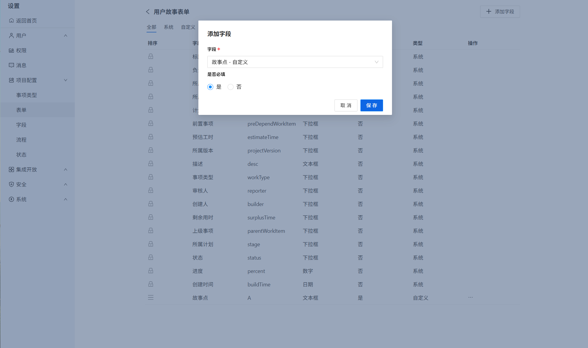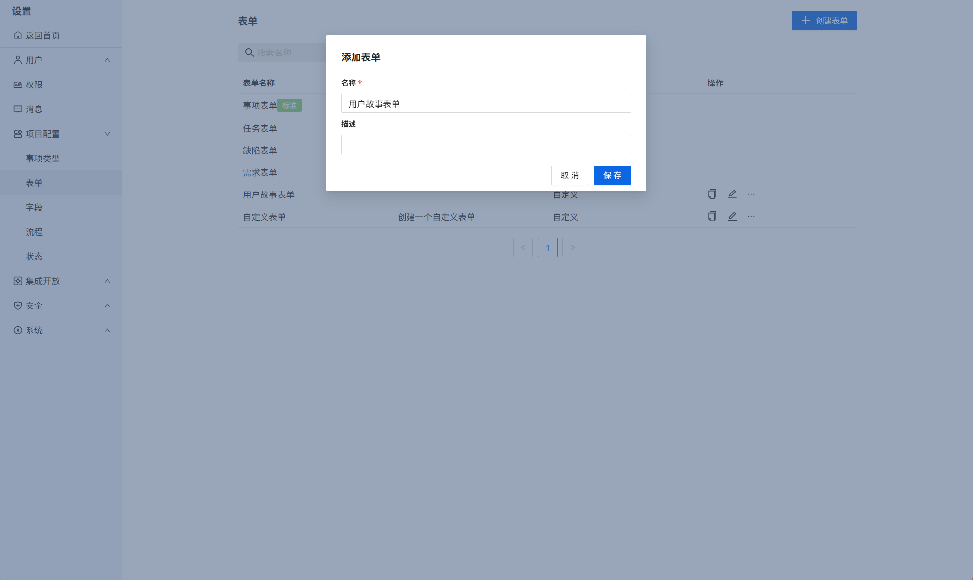 项目配置>表单->创建表单,填写表单名称后点击保存
