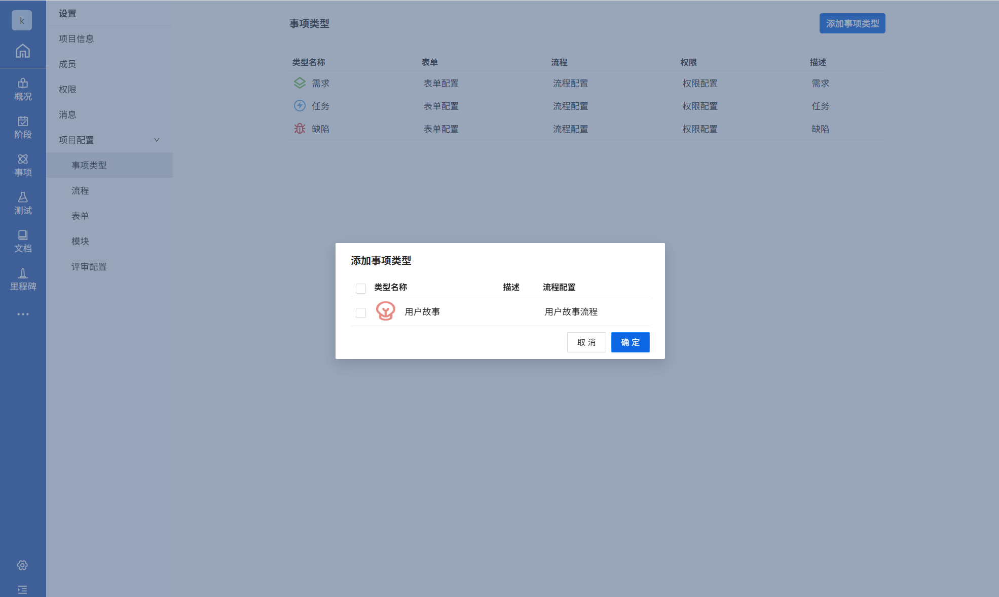 kanass内置多种事项类型,如需求、任务、缺陷。同时kanass支持用户自定义事项类型。