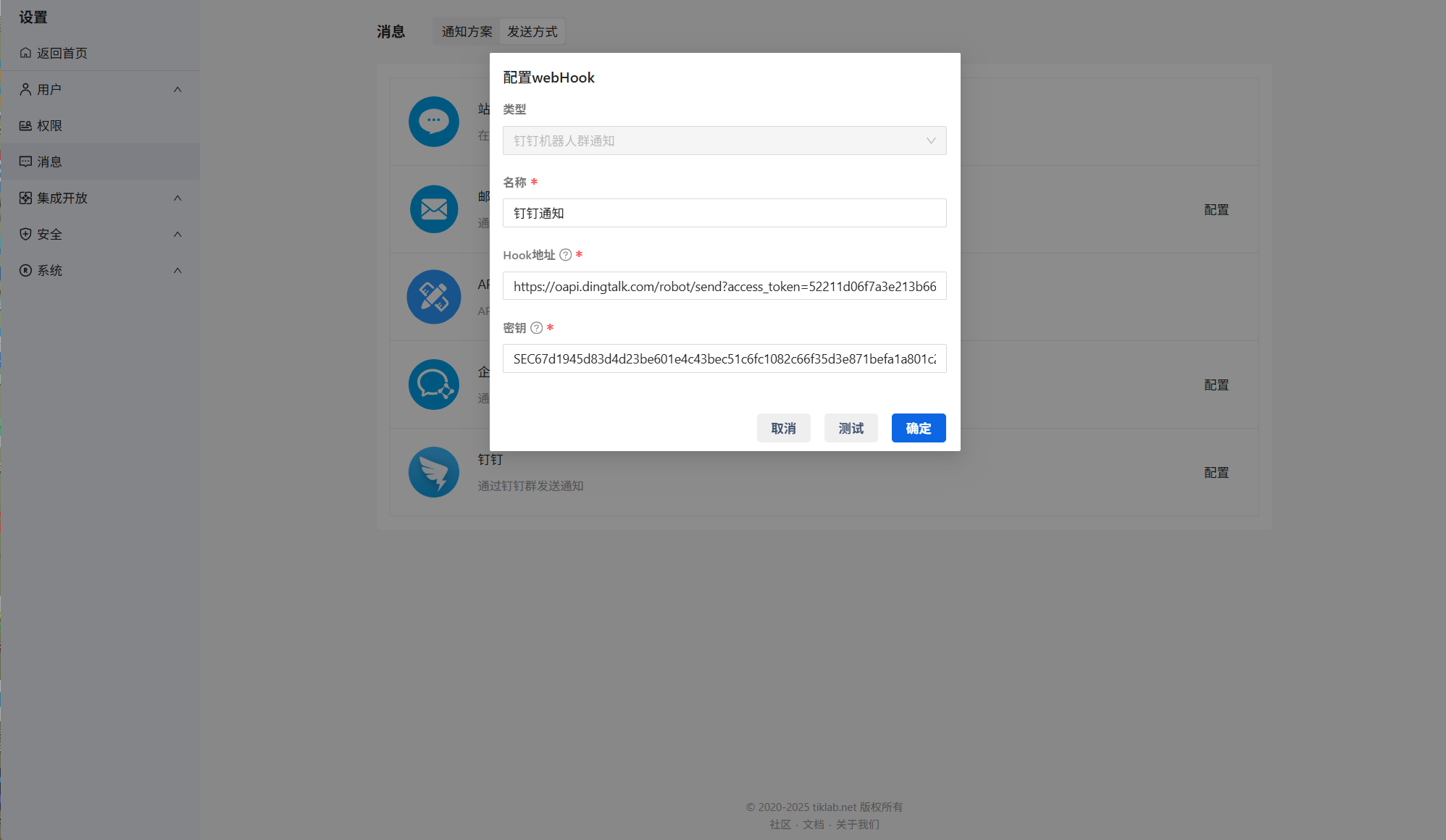| 秘钥 | 钉钉机器人Hook地址,通常在钉钉打开任意一个群聊 --> 右上角点击群设置->机器人->添加机器人 --> 选择自定义类型并添加->勾选加签,生成的一串数字就是秘钥 |