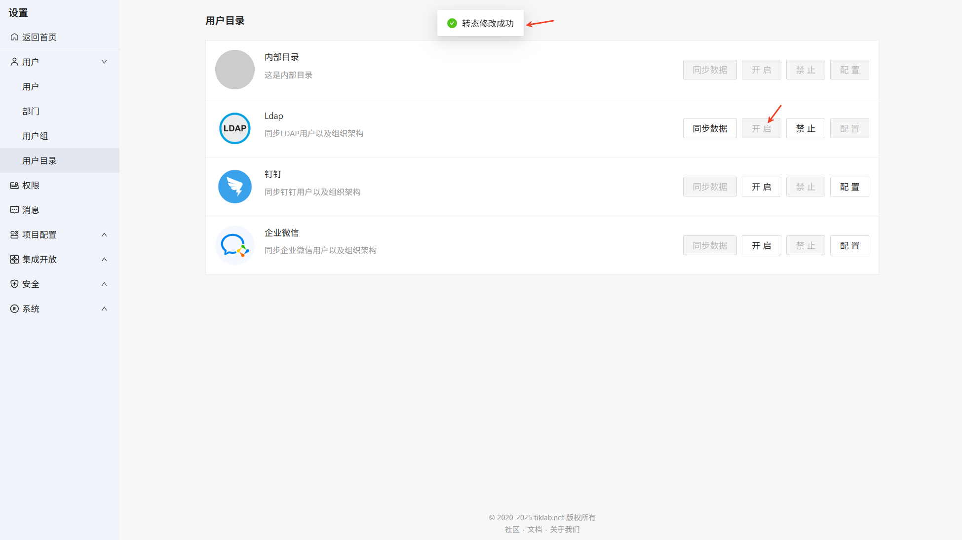 Ldap配置完成后,点击用户目录中的开启按钮。会提示“状态修改成功”。此时同步数据按钮亮起。点击同步数据按钮,即可将Ldap下的用户同步到用户页面。