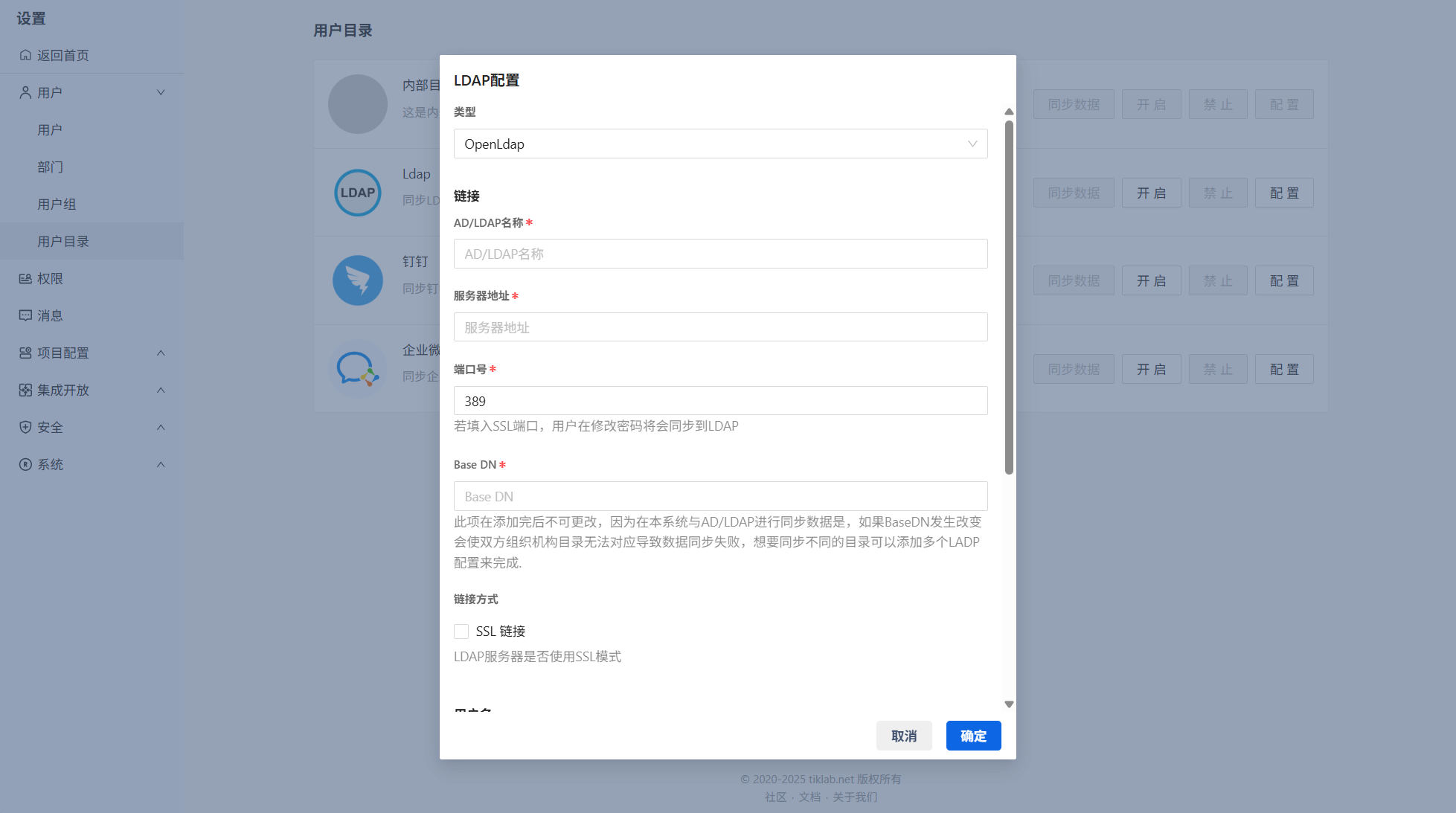 进入系统设置->用户->用户目录,点击Ldap后的配置按钮,填写Ldap的配置信息。