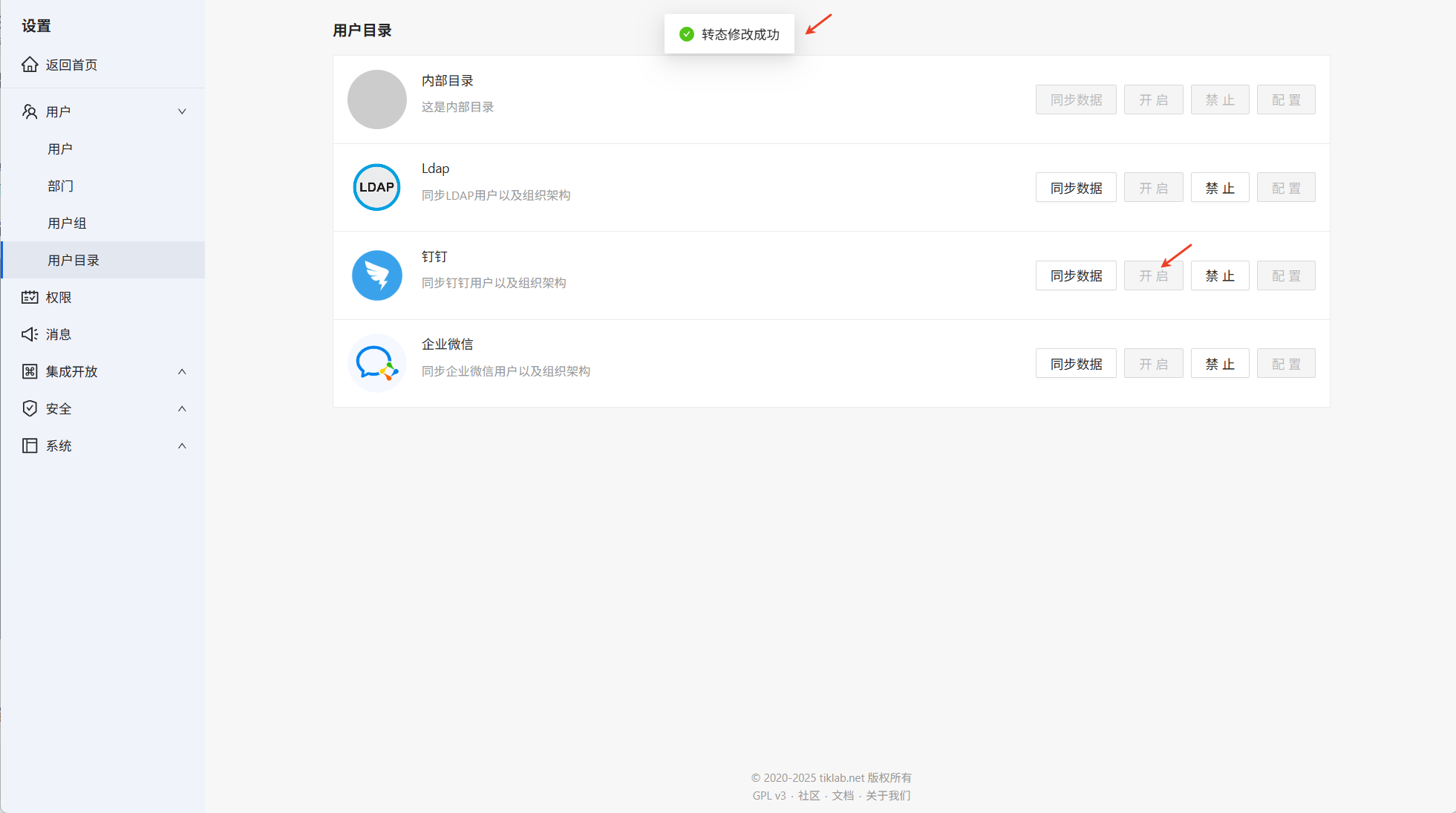 钉钉配置完成后,点击用户目录中的开启按钮。会提示“状态修改成功”。此时同步数据按钮亮起。点击同步数据按钮,即可将钉钉下的用户同步到用户页面。