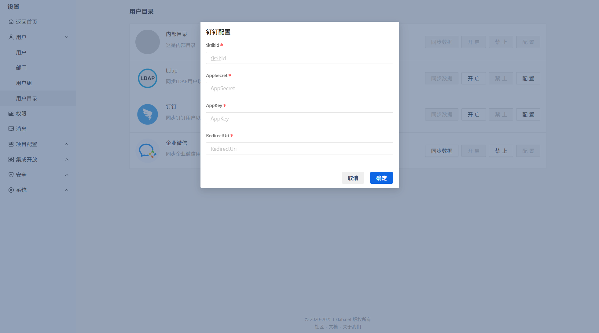 进入系统设置->用户->用户目录,点击钉钉后的配置按钮,填写钉钉的配置信息。
