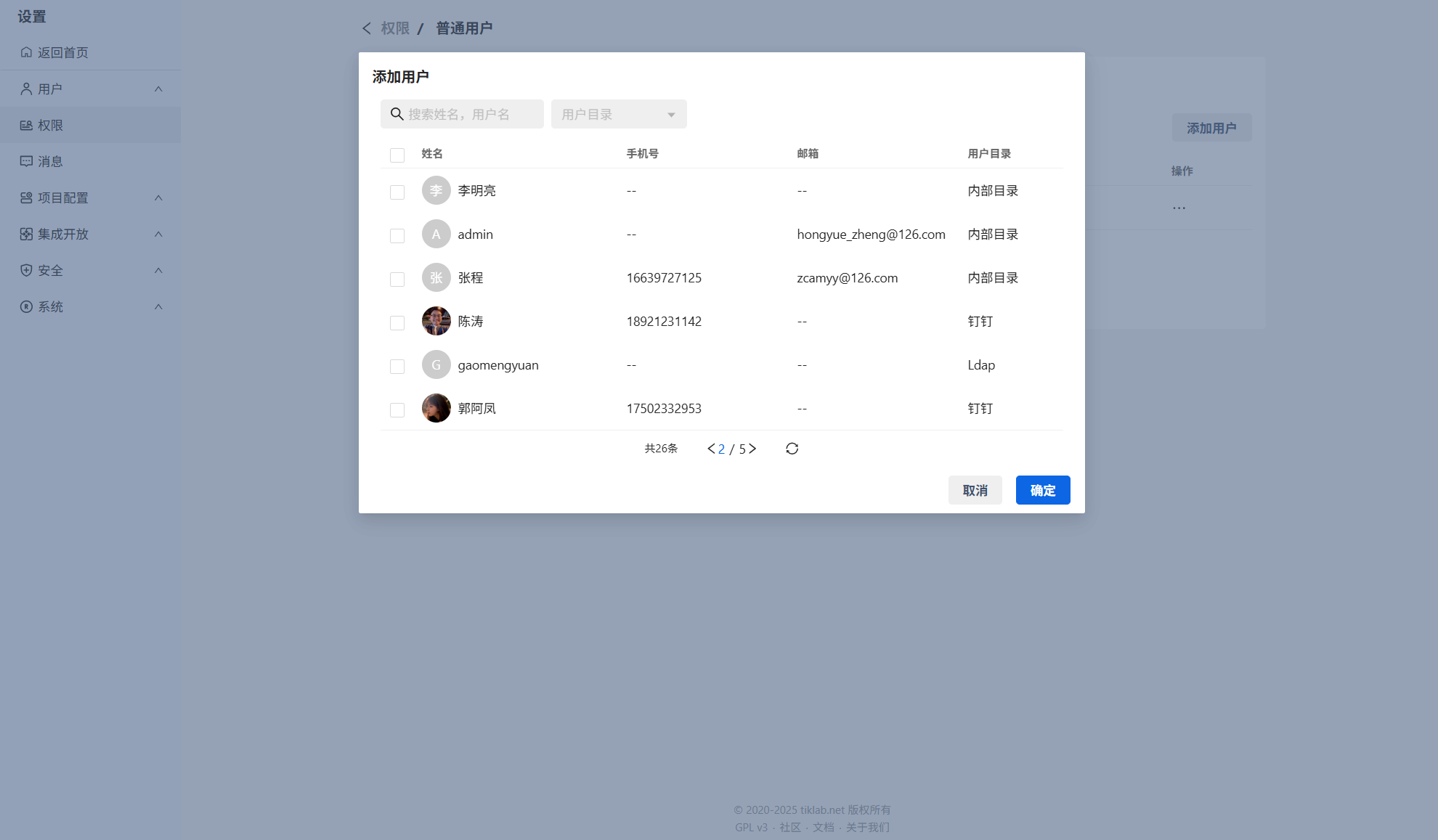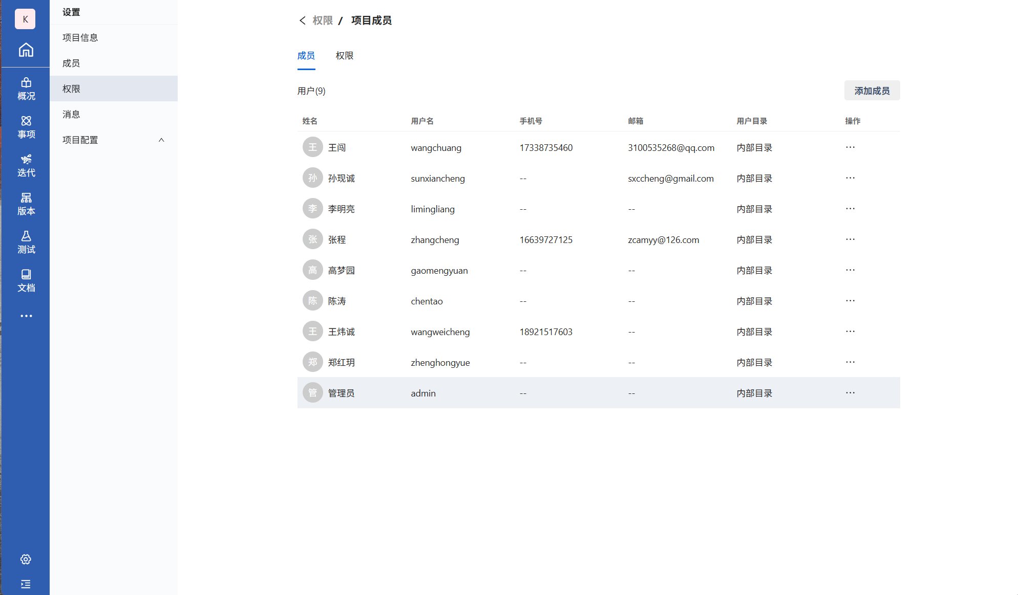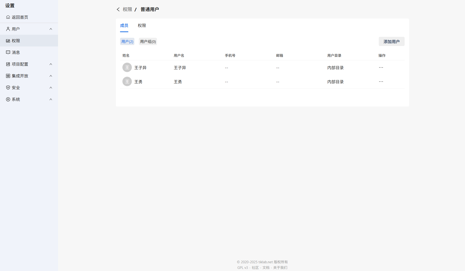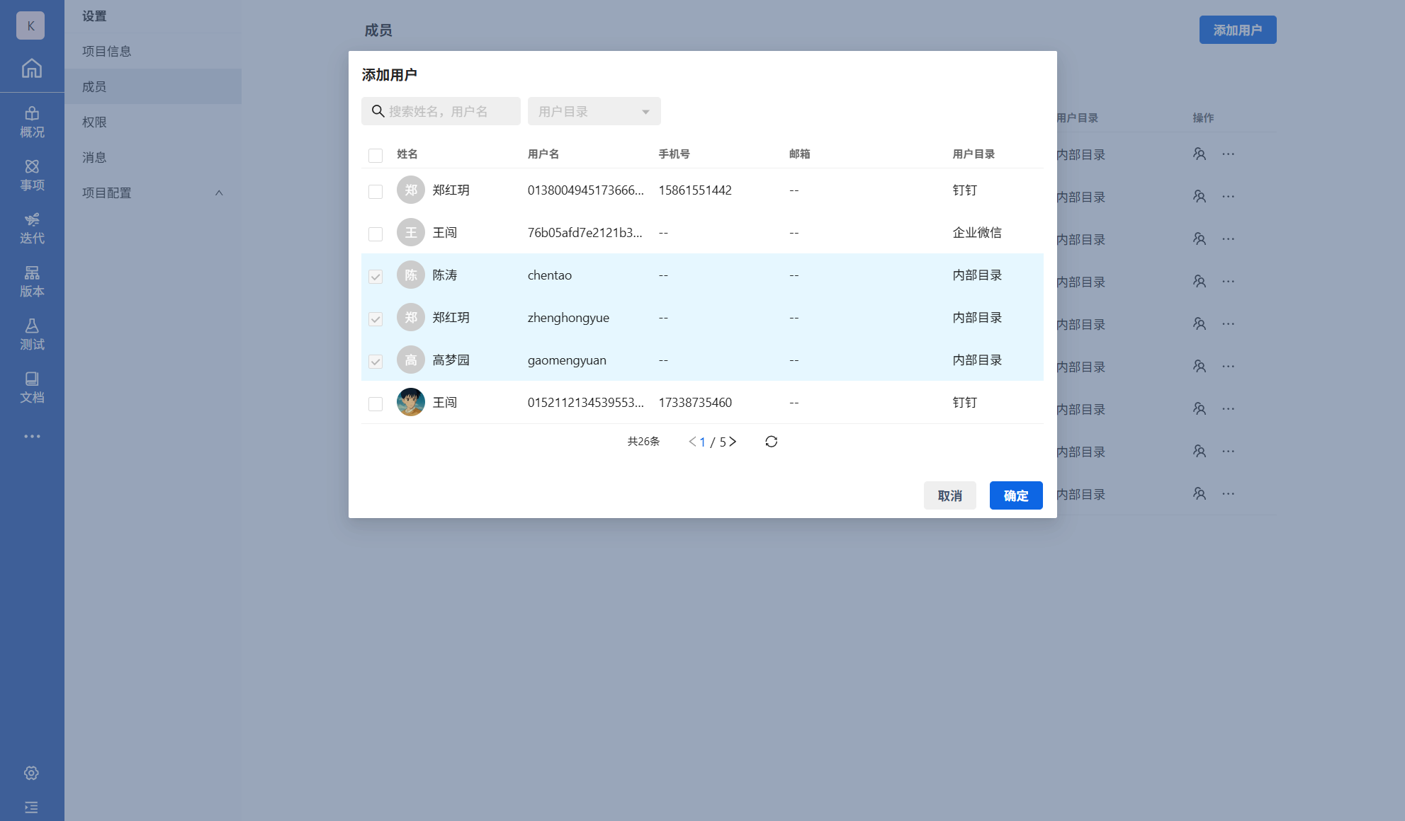 项目设置->成员,点击添加用户,将系统中的用户添加到项目中