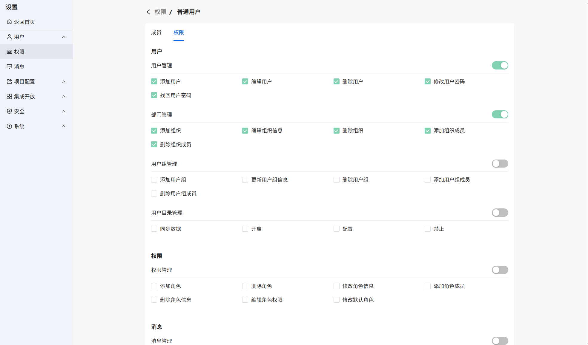 修改权限后,当前角色下的成员或用户组下成员,都具备此权限。