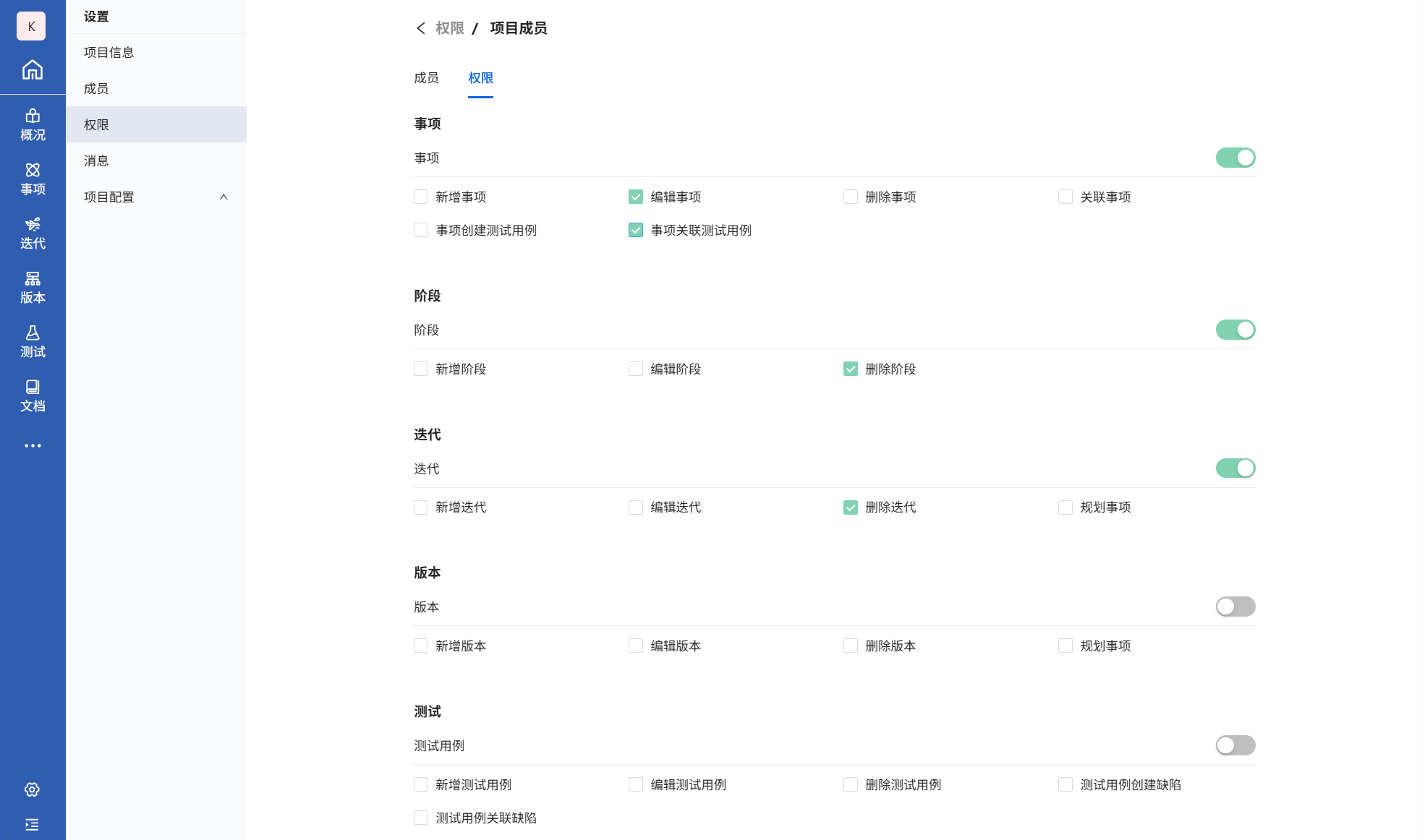 进入项目,点击项目设置->权限,此页面可以为项目设置独立角色与权限。