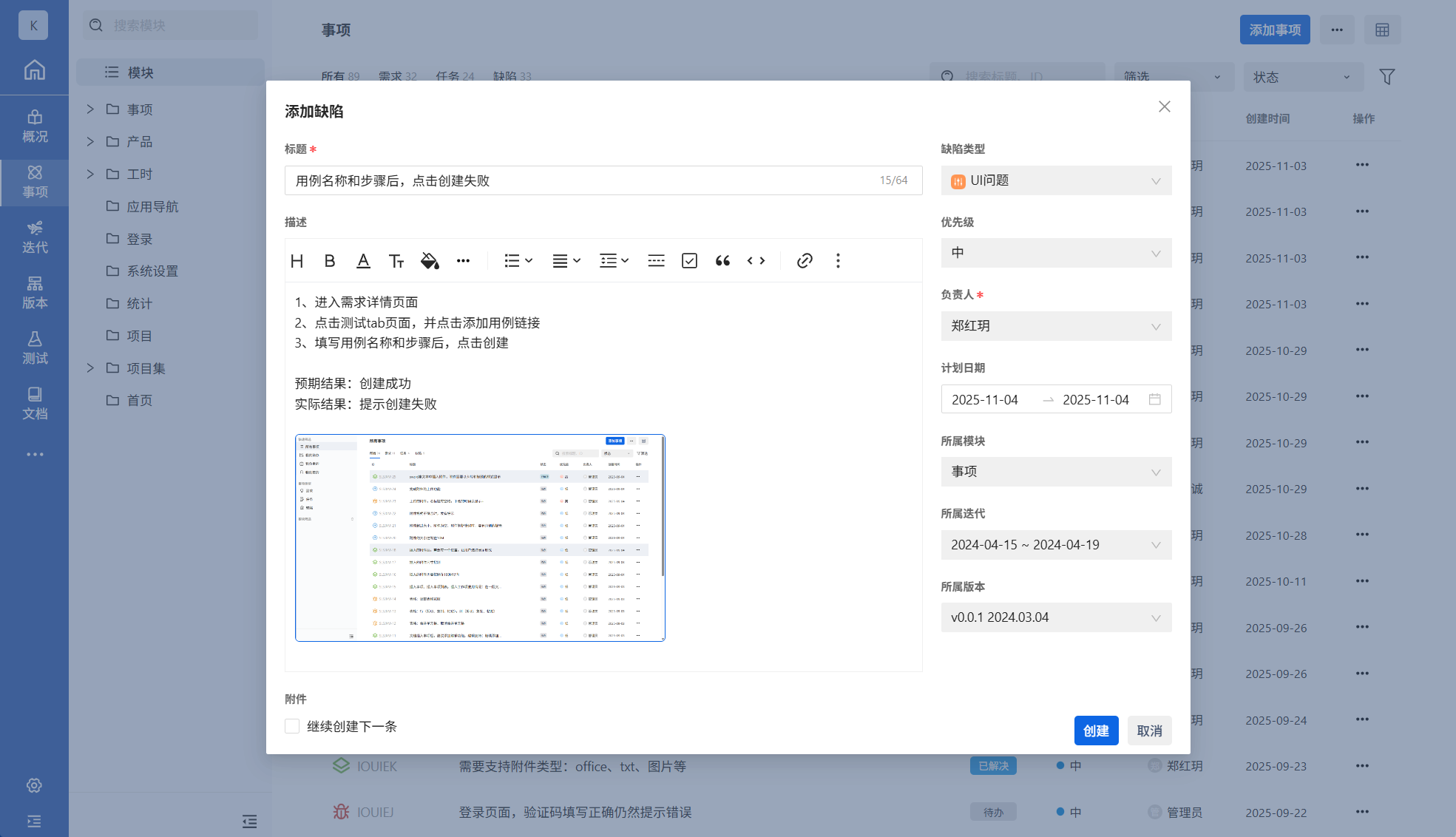 | 事项管理 | 内置事项类型 | ✔ 仅有bug类型 | ✔ |