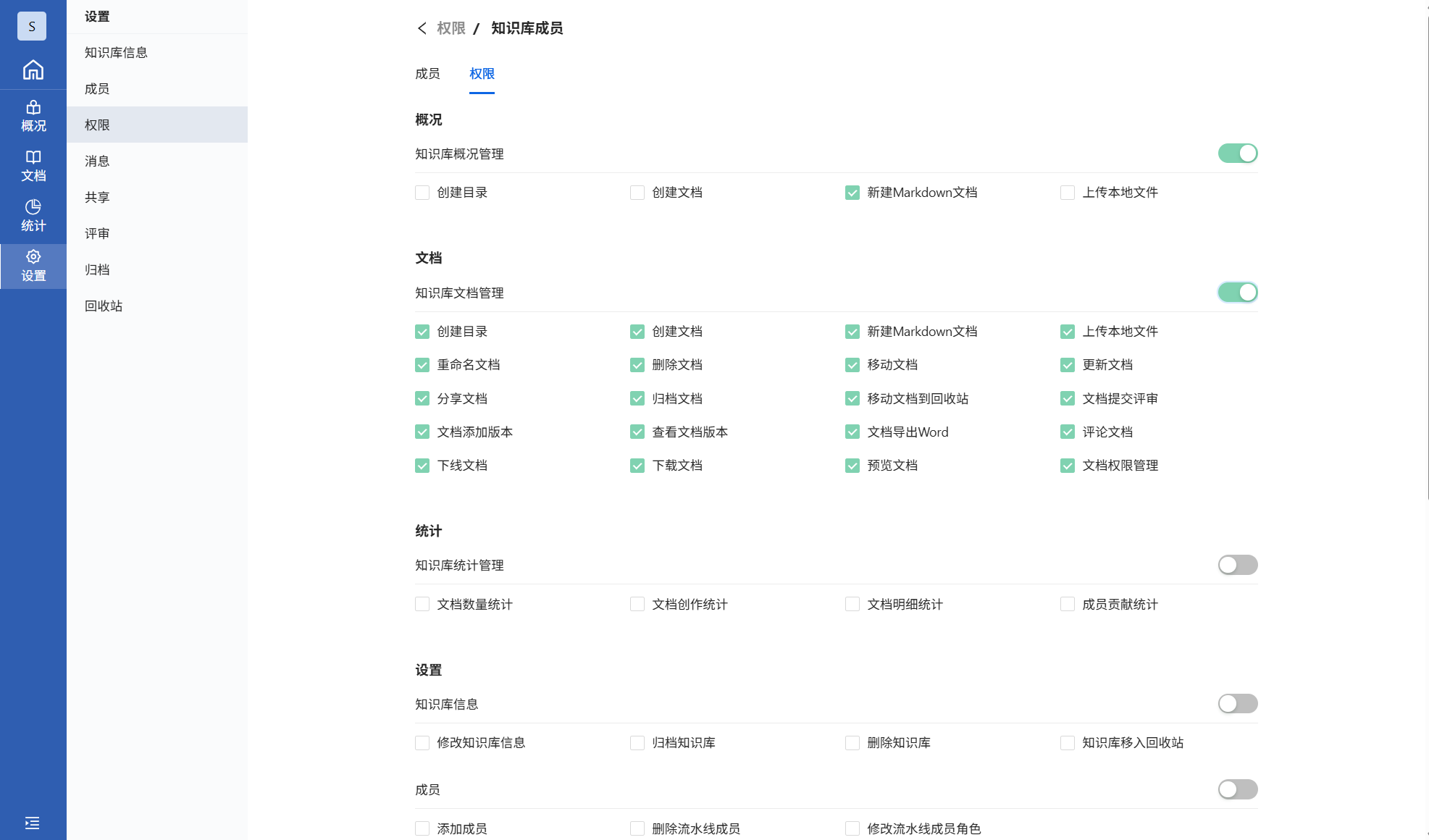 进入知识库,点击知识库设置->权限,此页面可以为知识库设置独立角色与权限。