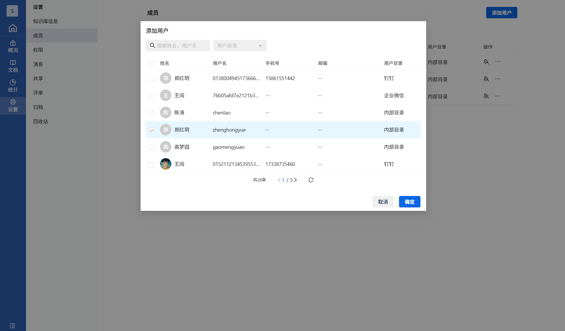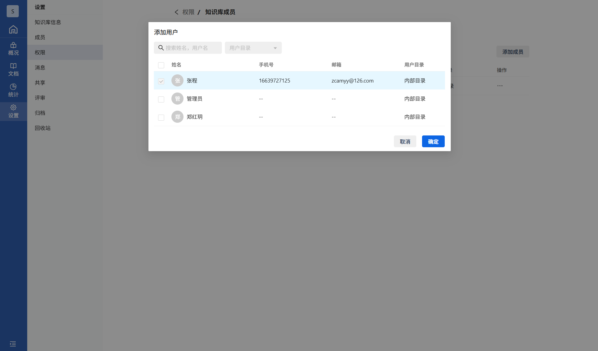 知识库设置->成员,点击添加用户,将系统中的用户添加到知识库中