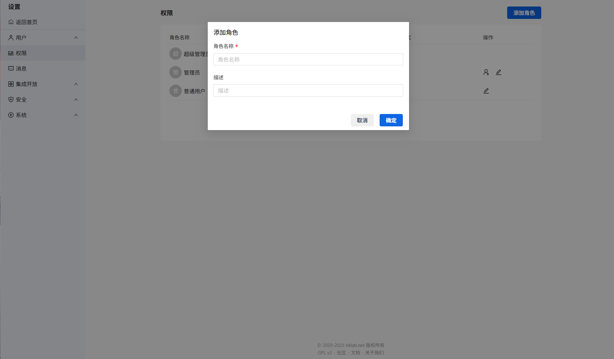 点击添加角色,输入角色名称后确定,角色创建成功。