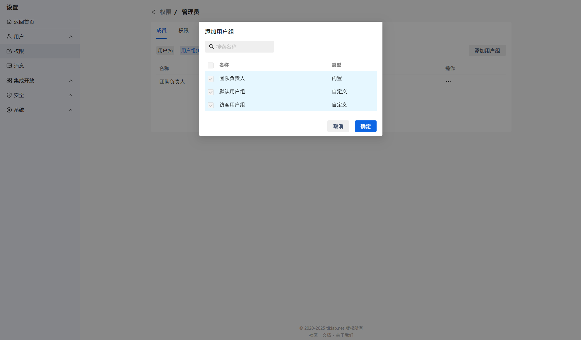 切换到用户组,点击添加,会显示系统中所有的用户组。勾选需要添加的用户组后确定,用户组添加成功