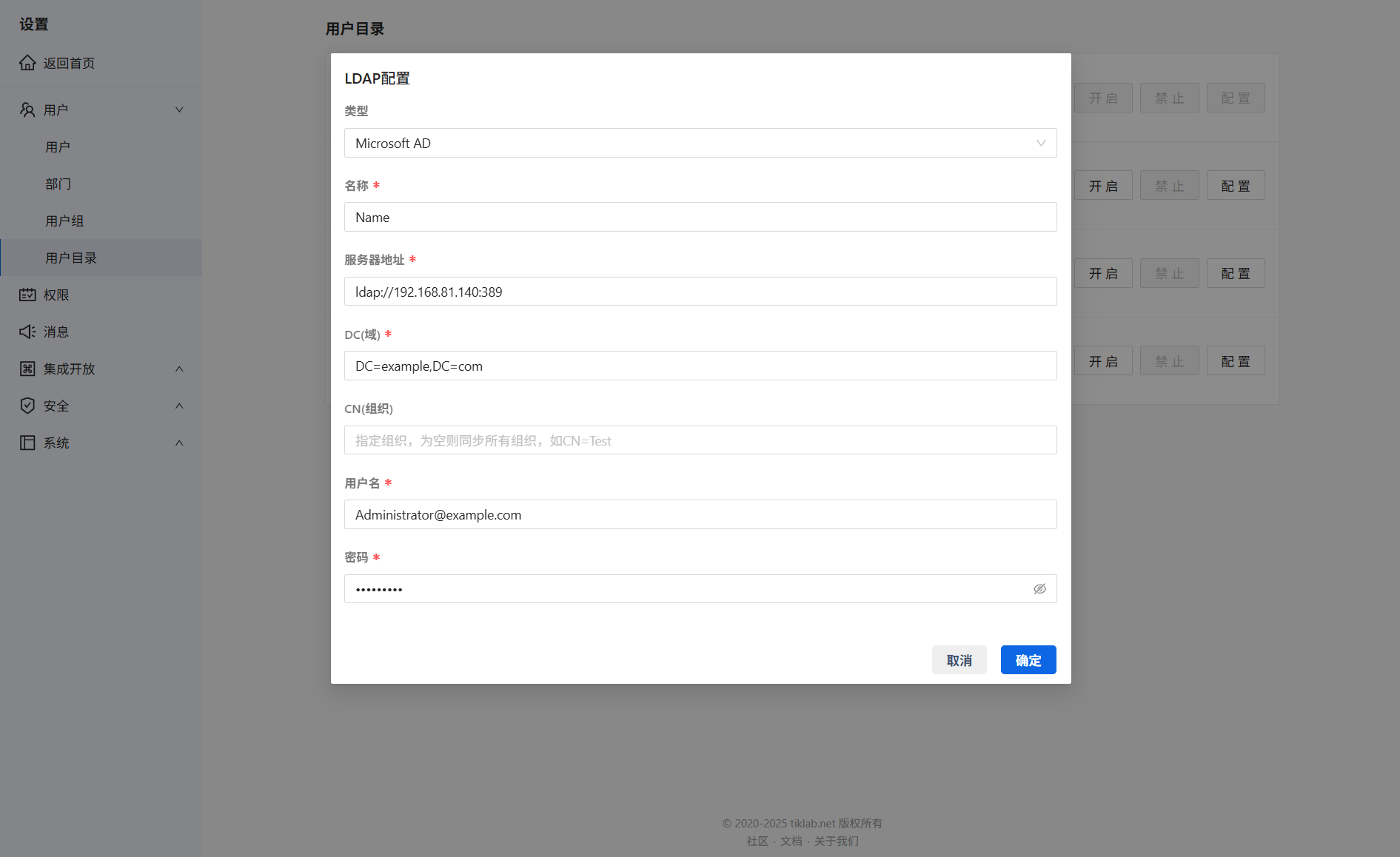 进入系统设置->用户->用户目录,点击Ldap后的配置按钮,填写Ldap的配置信息。
