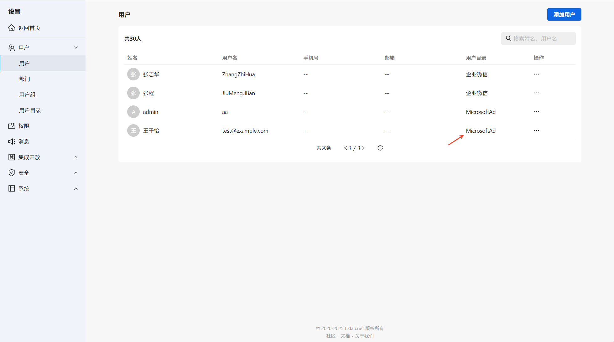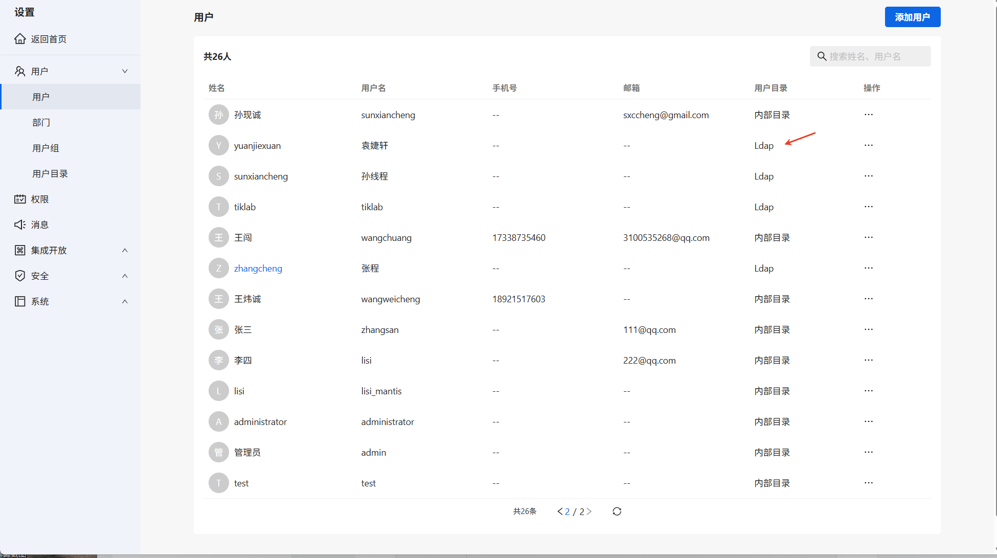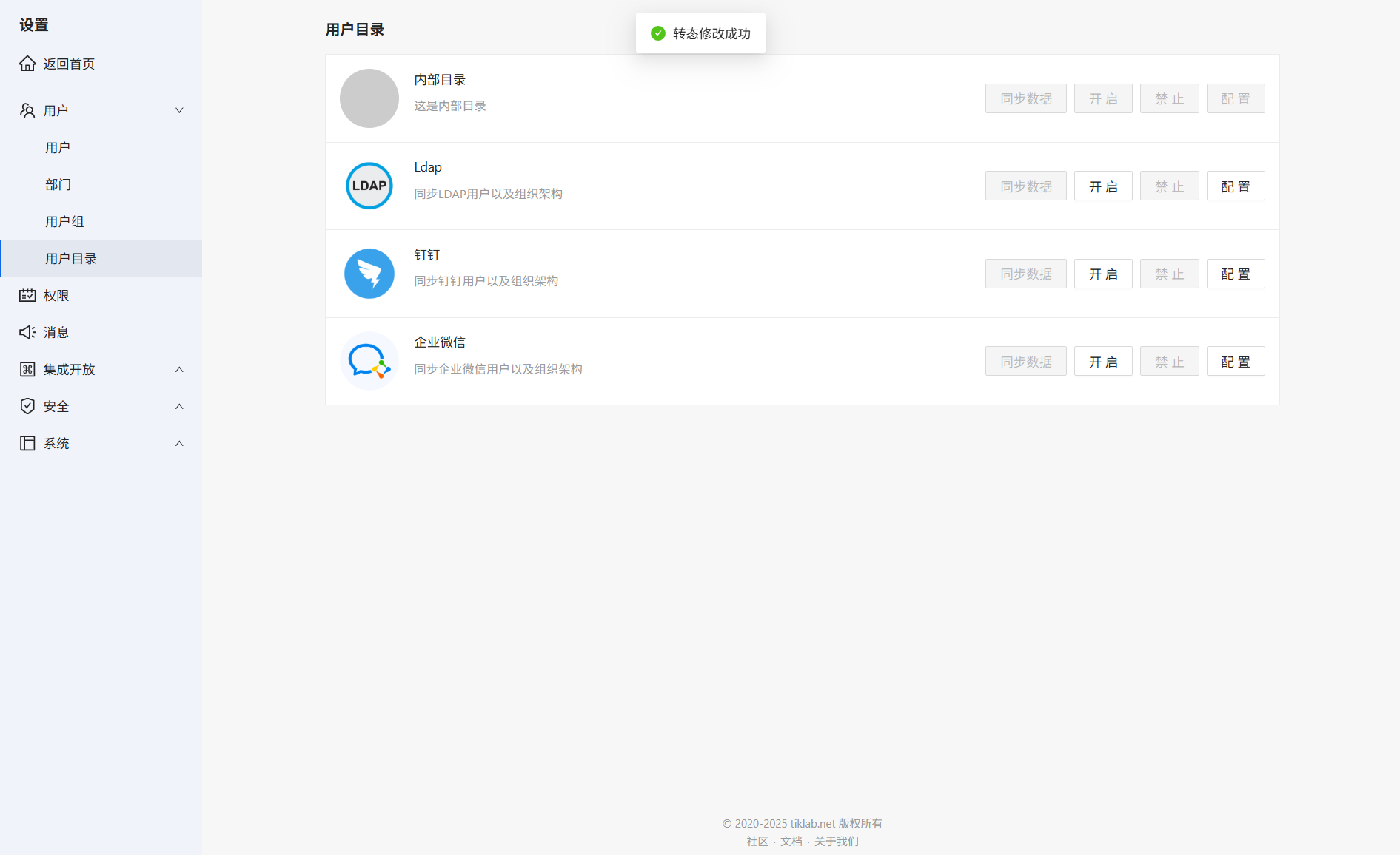 Ldap配置完成后,点击用户目录中的开启按钮。会提示“状态修改成功”。此时同步数据按钮亮起。点击同步数据按钮,即可将Ldap下的用户同步到用户页面。