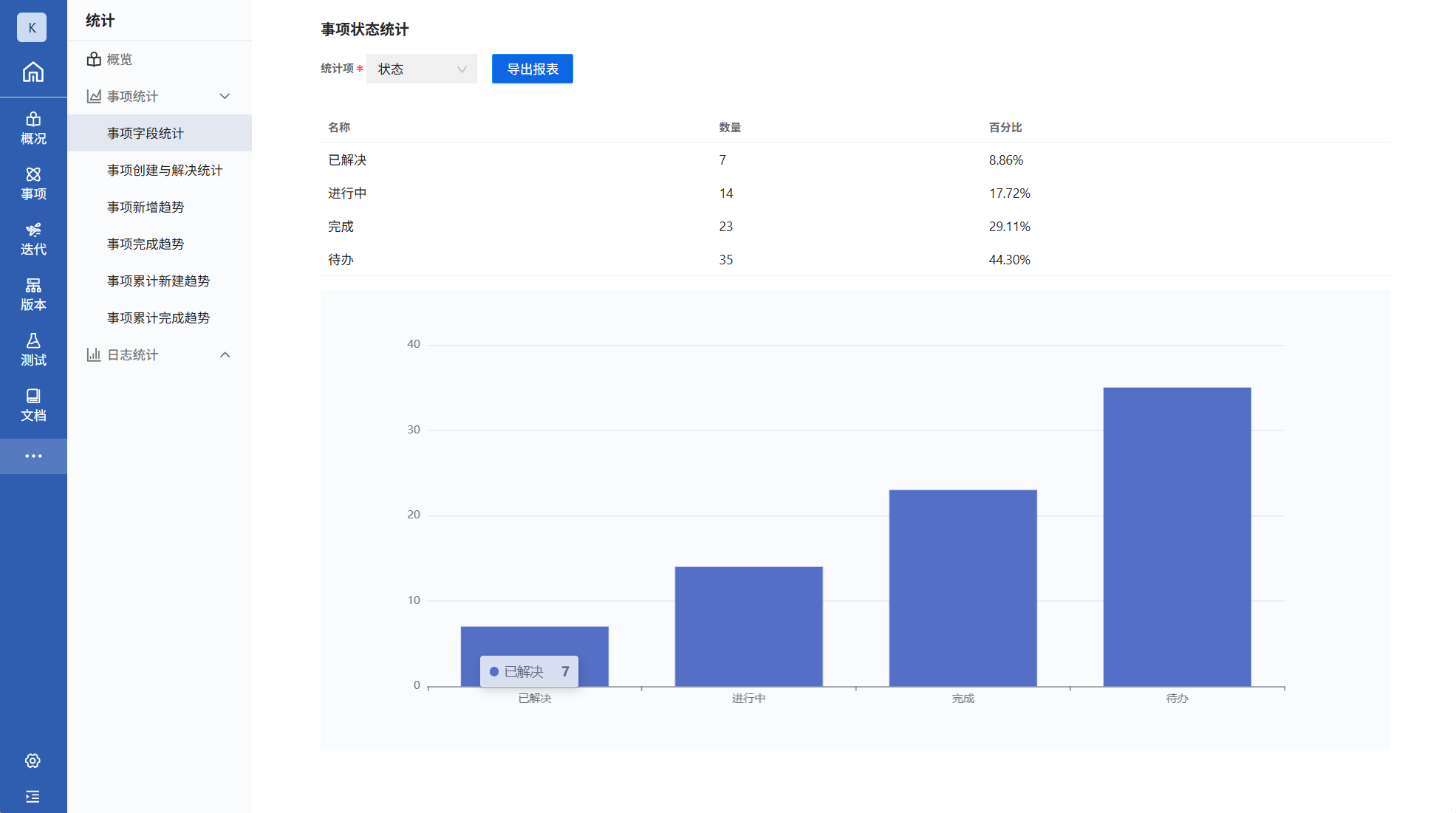 从不同的维度统计分析事项,便于管理者充分了解项目的进程