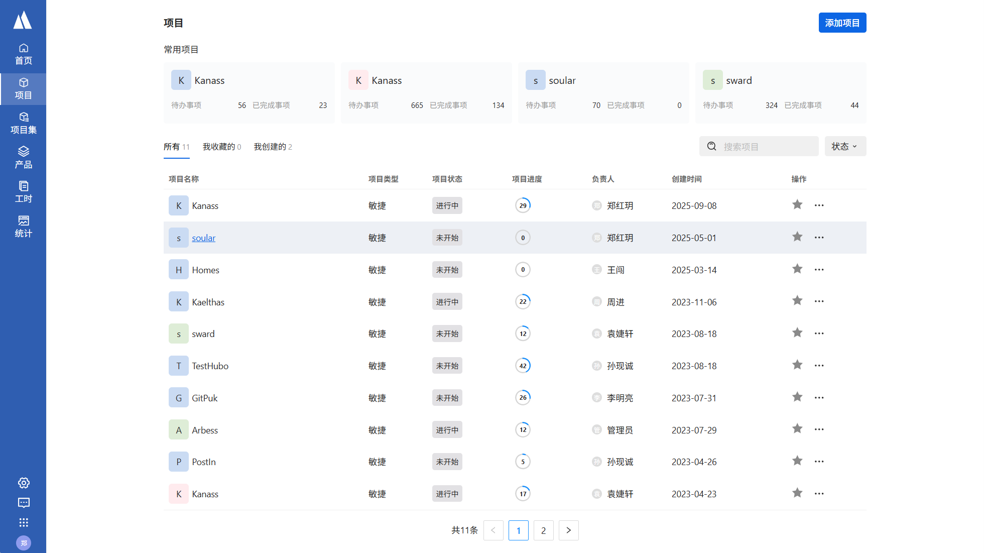 项目内包含迭代、计划、版本、里程碑等模块功能,还集成了sward知识库和TestHubo接口测试,便于使用文档和直接测试