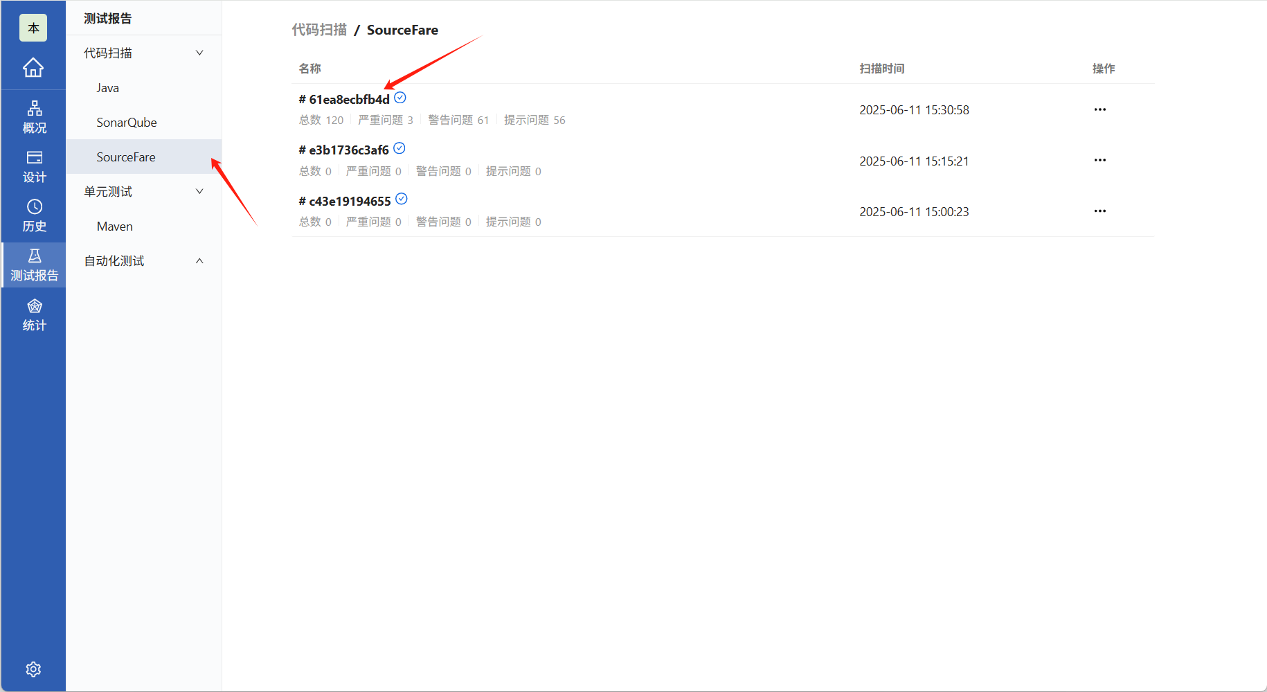成功进行代码扫描,点击测试报告→代码扫描→SourceFare,查看SourceFare代码扫描报告。