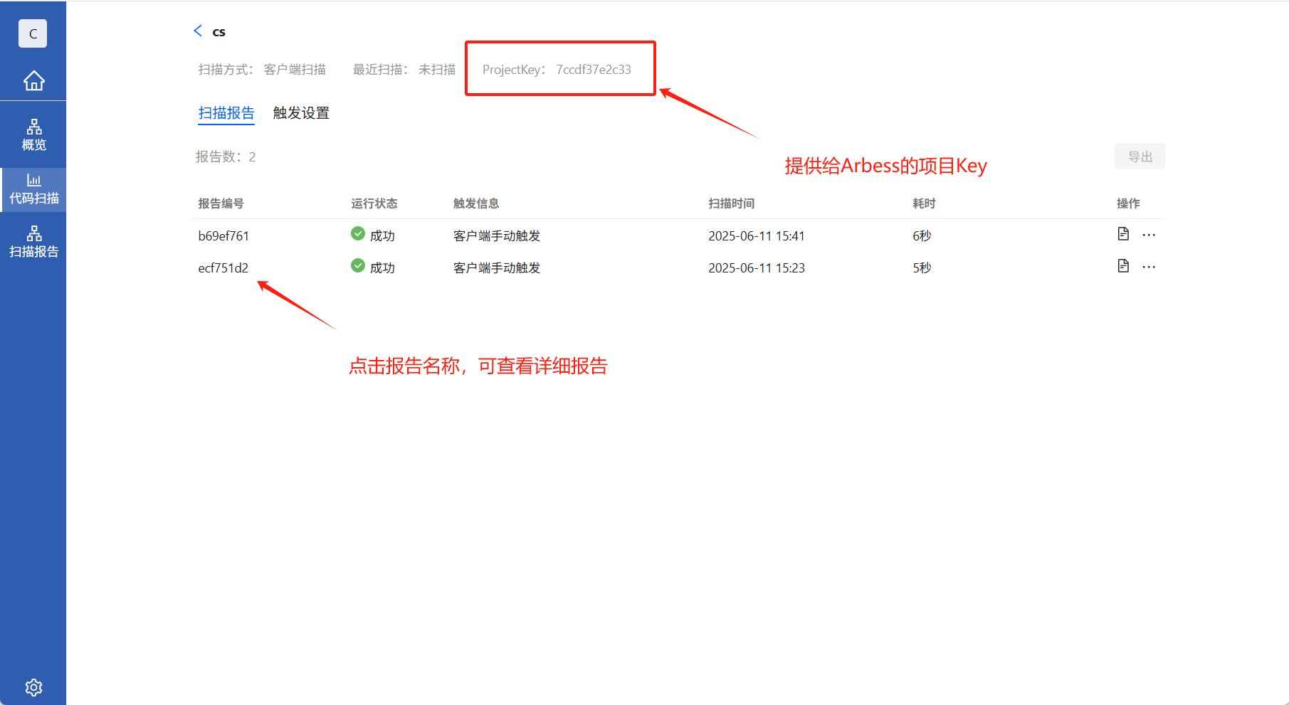 成功创建扫描计划后,在扫描计划页面,需要记住ProjectKey,后期Arbess集成SourceFare需要用到,也可查看Arbess调用的历史扫描计划报告。