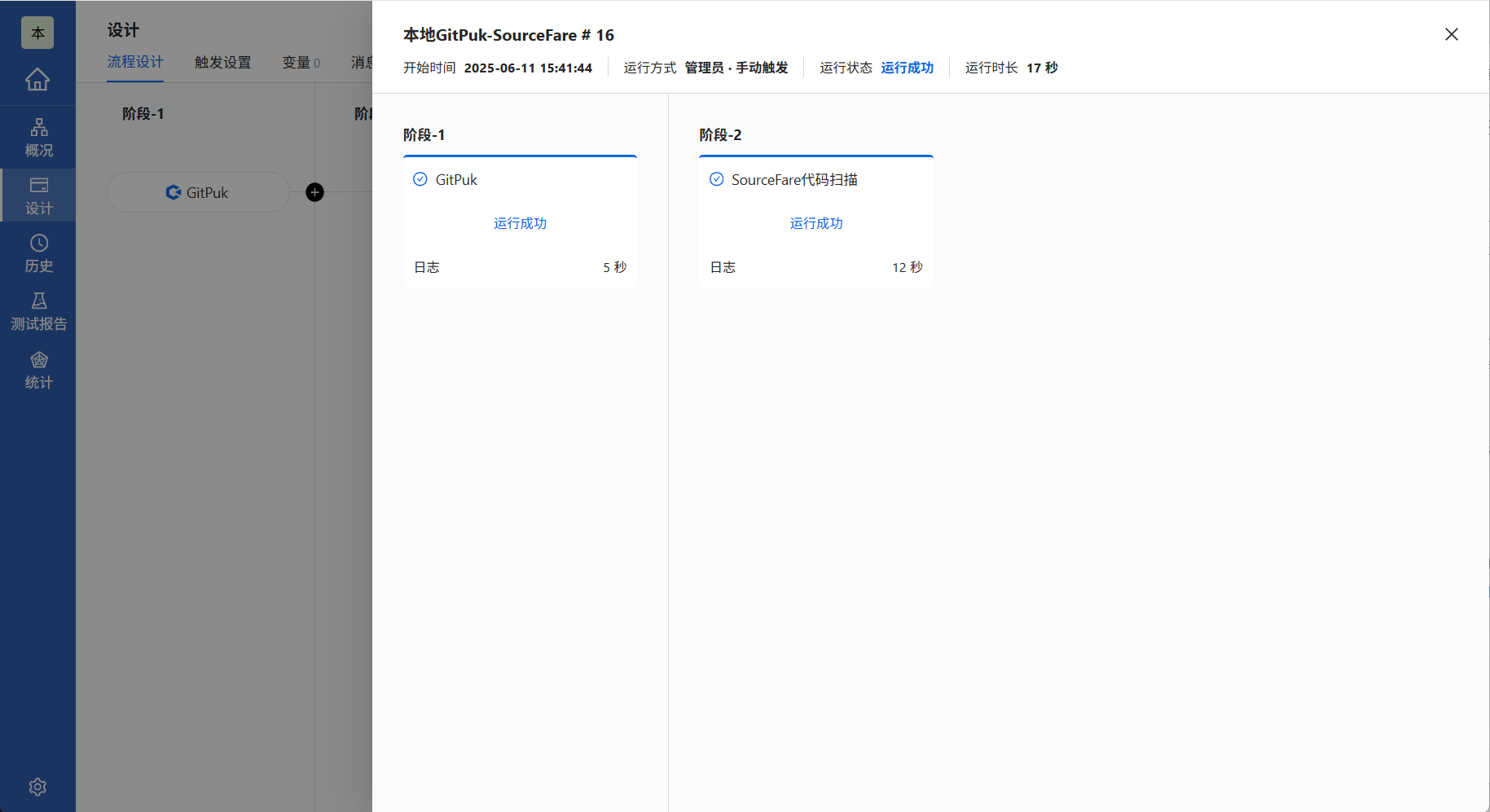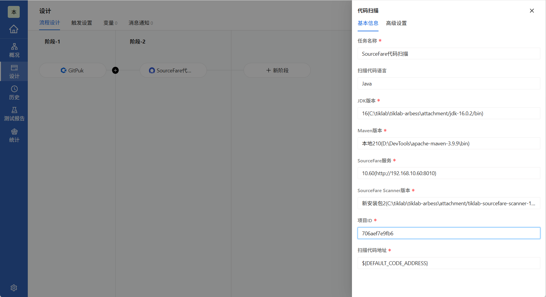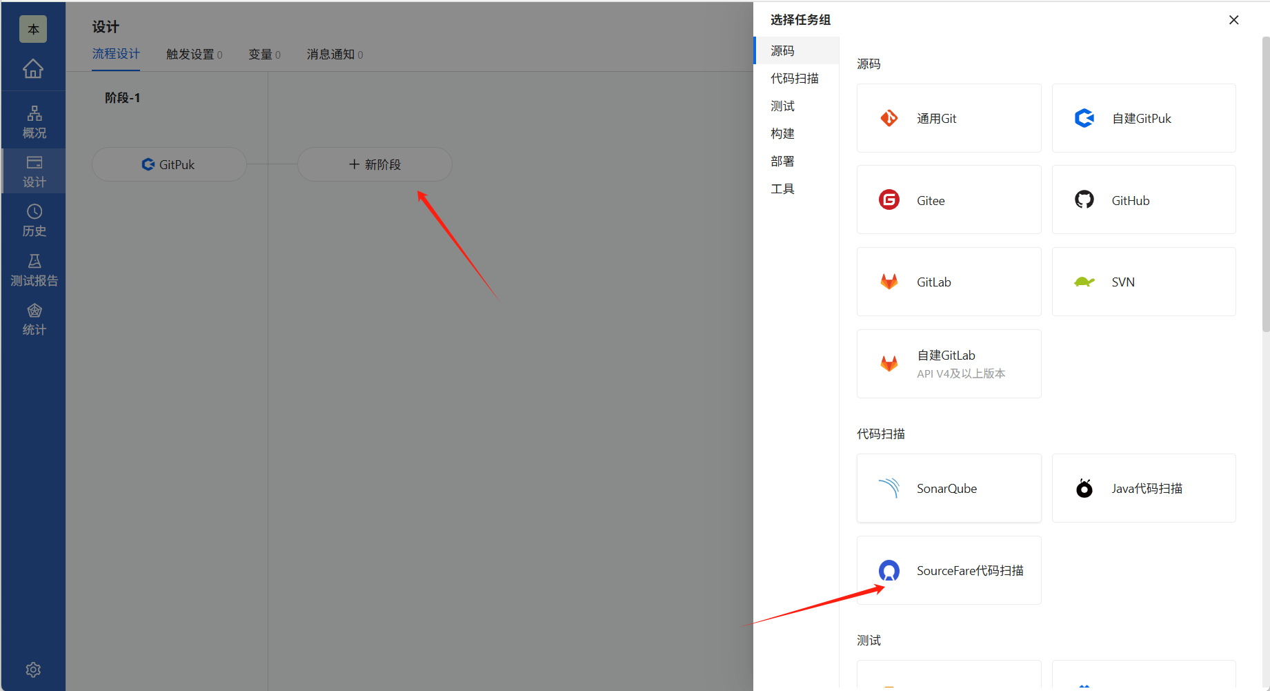 添加源码任务完毕之后,点击新阶段→代码扫描→SourceFare代码扫描。