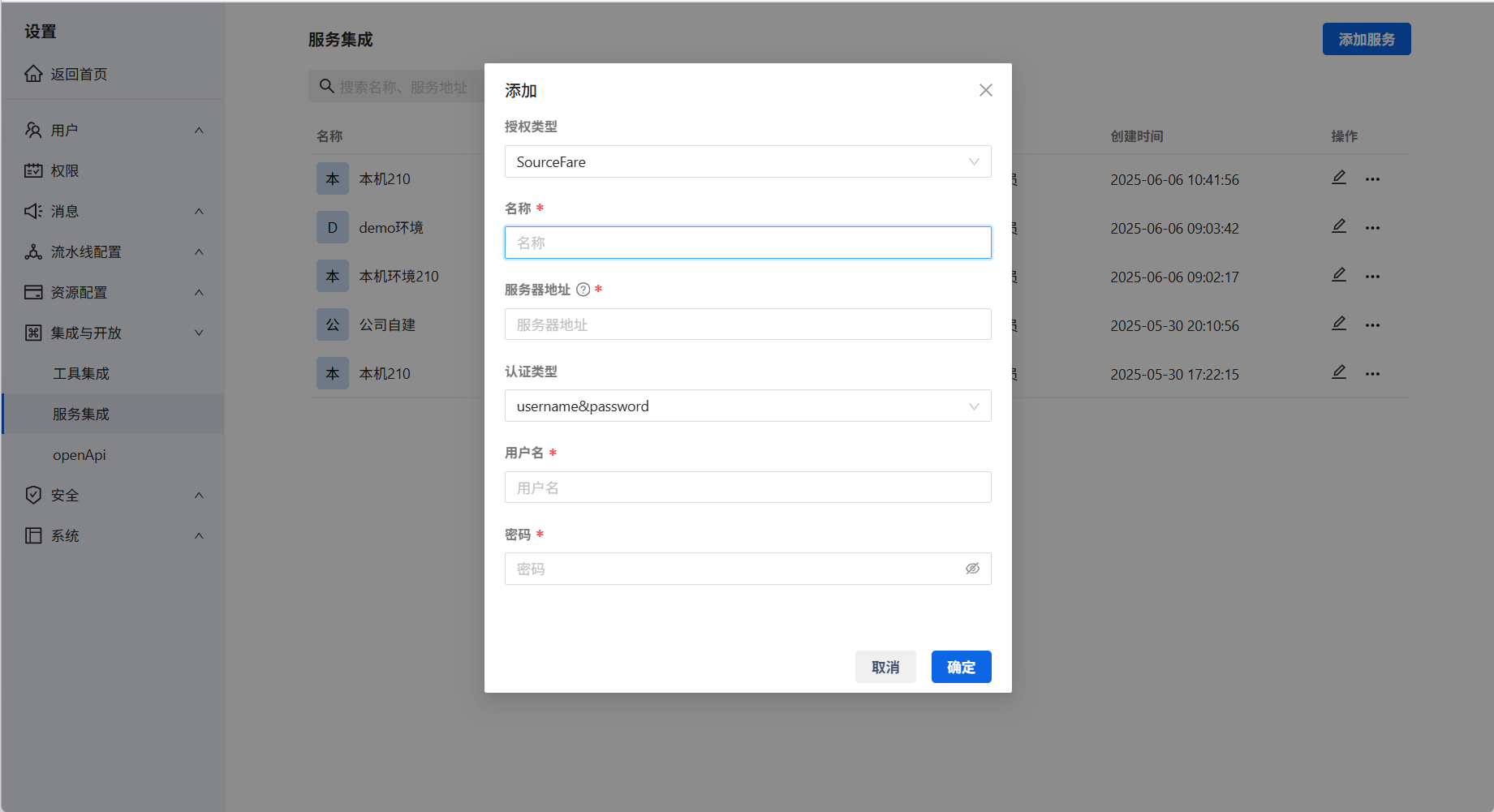 在系统设置→集成与开放→服务集成页面添加相关服务。授权类型选择SourceFare、填写名称、服务地址、认证类型(用户名密码、密钥)、用户名、密码。
